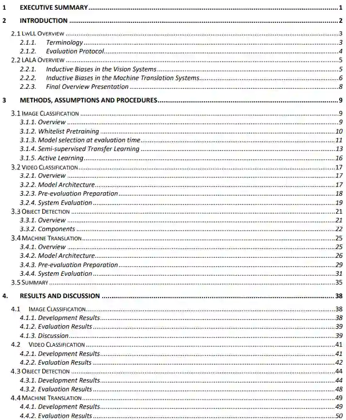 本报告的组织结构如下。首先,我们介绍了 DARPA LwLL 计划的评估协议,并描述了我们应对使用较少标签学习所面临挑战的主要框架。随后是方法论部分,描述了我们的框架如何适应 LwLL 评估中考虑的四个问题:图像分类、物体检测、视频分类和机器翻译。然后,我们在 "结果与讨论 "部分报告了评估结果和发现。最后,我们总结了我们的贡献以及对未来少标签学习的思考,以此结束本报告。