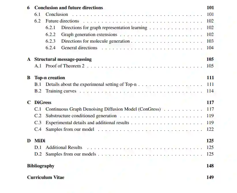 在第4章,我们提出了一个图生成架构,经过在QM9数据集上训练6小时后,可以生成60%的真实分子,这接近于发表时的最新技术水平。在第5章中提出的模型中,我们在同一数据集上在一个小时内达到了99%的有效性,大部分改进来自于另一个问题表述,不需要在潜在空间中压缩数据。