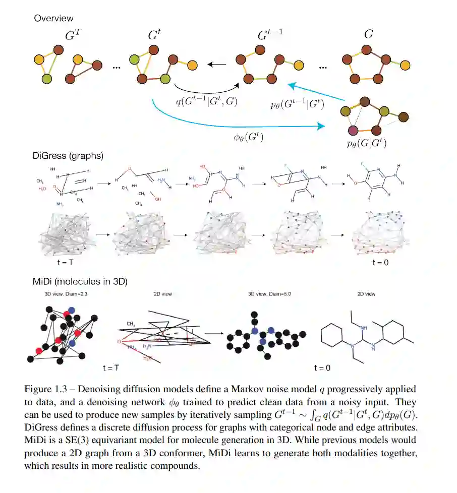 我们接着展示,通过构建去噪扩散模型,即那些迭代去噪随机集合或图的结构,性能可以得到大幅提升。具体来说,我们提出DiGress模型用于图生成,以及MiDi用于联合生成分子的2D和3D结构。这些模型利用了图的离散结构,并能够在扩散过程中保持其稀疏性。因此,它们可以成功地模拟比以前的高斯扩散模型更大的图。