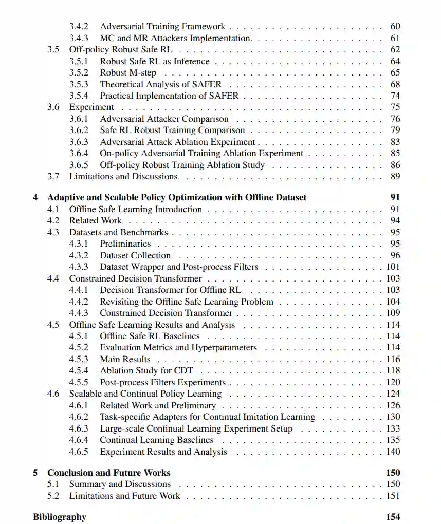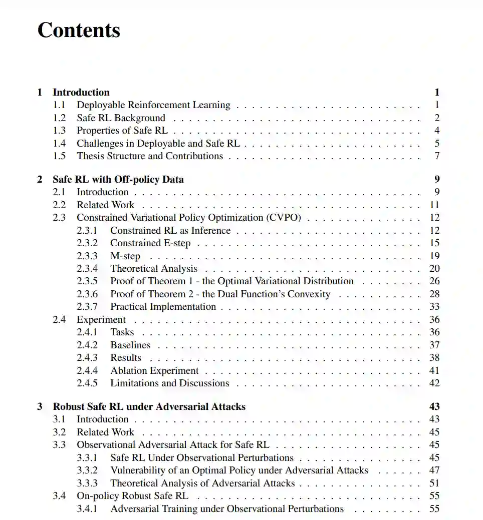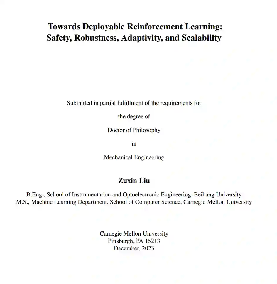总之,本论文致力于推动安全、鲁棒和可扩展策略优化的界限,朝着在安全关键领域可部署RL迈进。所提出的方法提供了鲁棒、高效和可适应的解决方案,这对RL系统的现实世界部署至关重要。 随着强化学习(RL)继续成熟并扩展其视野,从模拟环境过渡到真实世界的应用,使RL在实际的安全关键领域可部署的重点日益加强。可部署的RL指的是RL系统在复杂、动态且往往是高风险环境中安全、可靠且高效地互动和学习的能力。这包括自动驾驶车辆在城市交通中导航、金融系统执行交易或医疗机器人协助手术。为了使RL可部署,它必须遵守严格的安全、鲁棒性、适应性和可扩展性要求——确保RL代理在多变和不可预测的现实世界条件下表现得当。
