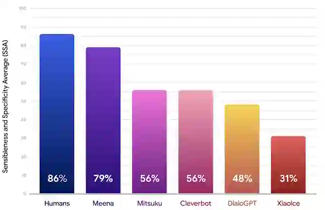 我们最好的端到端训练的Meena模型,称为Meena (base),达到了10.2的perplexity(越小越好),转换成SSA分数72%。与其他chabots所取得的SSA分数相比,我们72%的SSA分数与普通人86%的SSA相差无几。完整版的Meena具有过滤机制和调谐解码,进一步将SSA分数提高到79%。
