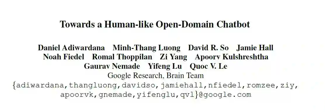 【导读】最近全国人们都在众志成城抗击新冠毒肺炎疫情,春节马上过去,疫情还比较严重,还是呆在家里好好学习吧!今天Google大脑研究团队发布了最新对话AI的研究成果,一个有26亿参数的端到端训练的神经会话模型-Meena聊天机器人,能够产生比肩人类的会话质量,可达到79%的开放域聊天满意度。来看看这篇研究成果,然后利用假期看下这篇论文。