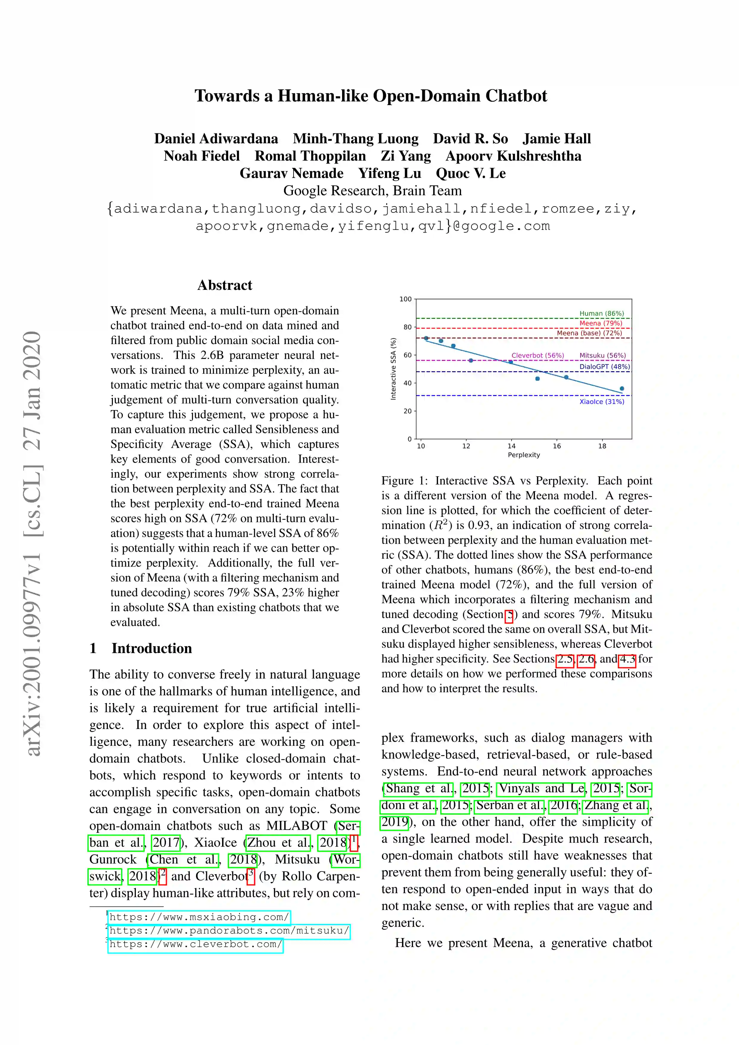 我们介绍了Meena,一个多回合的开放域聊天机器人,它根据从公共域社交媒体对话中挖掘和过滤的数据进行端到端的训练。这个26亿的参数神经网络被训练来最小化困惑度,这是一个我们用来与人类判断的多回合对话质量进行比较的自动度量。为了捕捉这种判断,我们提出了一种新的人工评价指标,称为意义度Sensibleness 和具体度平均(SSA),它捕捉了良好交谈的关键元素。有趣的是,我们的实验显示了perplexity和SSA之间很强的相关性。如果我们能够更好地优化perplexity,端到端训练的最佳perplexity在SSA中的得分(多轮评估中为72%)表明86%的人类水平SSA是可以达到的。此外,完整版的Meena(带有过滤机制和调谐解码)得分79%,比我们评估的排名第二的聊天机器人高23%。