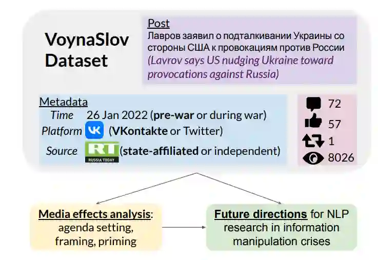 有关舆论操纵活动的 NLP 研究主要集中于检测假新闻和虚假信息等公开策略。然而,正在进行的俄乌战争中的信息操纵活动体现了政府和媒体如何运用更细微的策略。本文发布了一个新的数据集 VoynaSlov,其中包含俄罗斯媒体在 Twitter 和 VKontakte 上发布的 3800 多万条帖子,以及 2022 年俄乌战争前夕和战争期间的公众活动和回应。我们在 VoynaSlov 上应用了标准的和最近开发的 NLP 模型,以研究议程设置、框架和引导(信息操纵的几种基本策略),并揭示了不同媒体控制、社交媒体平台和时间之间的差异。对这些媒体效应的研究以及对当前方法局限性的广泛讨论,鼓励了进一步开发 NLP 模型,以了解新兴危机中的信息操纵,以及其他现实世界和跨学科任务。