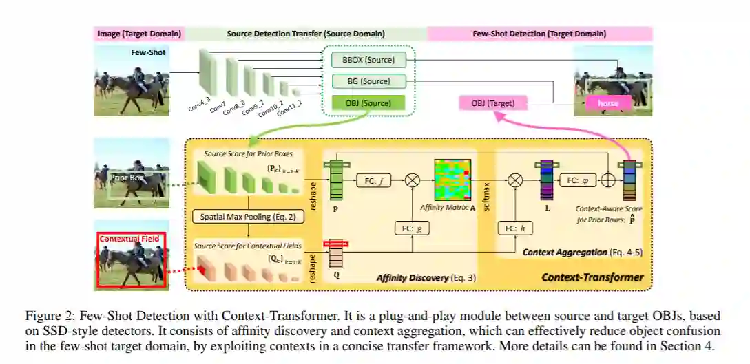 小样本目标检测是一个具有挑战性但又很现实的场景,只有少数带注释的训练图像可用于训练检测器。处理这个问题的一个流行的方法是迁移学习,对在源域基准上预先训练的检测器进行微调。然而,由于训练样本的数据多样性较低,这种转移的检测器往往不能识别目标域中的新对象。为了解决这一问题,我们提出了一个新颖的上下文转换器:一个简洁的深层传输框架。具体来说,Context-Transformer可以有效地利用源域对象知识作为指导,并自动地从目标域中的少量训练图像中挖掘上下文。然后,自适应地整合这些相关线索,增强检测器的识别能力,以减少在小样本场景下的目标混淆。此外,上下文转换器灵活地嵌入到流行的ssd风格的检测器中,这使得它成为端到端小样本学习的即插即用模块。最后,我们评估了上下文转换器对小样本检测和增量小样本检测的挑战性设置。实验结果表明,我们的框架比目前最先进的方法有更好的性能。