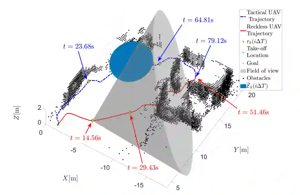 最后,介绍了用于自主无人机系统的综合制导和控制系统,该系统可在未知、动态和潜在敌对环境中,按照用户的要求,以不计后果或战术的方式执行战术覆盖。覆盖的制导问题涉及收集环境信息的策略和路线规划。收集未知环境信息的目的是帮助服务组织和第一反应人员了解态势和制定计划。为解决这一问题,需要综合考虑目标选择、路径规划、避免碰撞和轨迹规划。我们提出了一种基于八叉树数据结构的新型目标选择算法,用于为路径规划器自主确定目标点。在该算法中,由导航系统推导出的体素地图捕捉了环境中各区域的占用和探索状态,并被分割成捕捉大面积未探索区域和大面积已探索区域的分区。大面积未探索区域被用作候选目标点。目标点的可行性通过采用贪婪 A∗ 技术来确定。该算法拥有可调参数,允许用户在确定目标点序列时指定贪婪或系统行为。这种技术的计算负担是根据经验确定的,并证明可在现实场景中实时使用。路径规划器基于终身规划 A∗(LP A∗)搜索算法,与 A∗技术相比,该算法更具优势。此外,还提出了一种可自定义调整的成本-归宿和启发式函数,以实现战术或鲁莽的路径规划。提出了一种新的避免碰撞算法,作为上述避免碰撞算法的改进版本,改进了所产生的约束集的体积,从而使更多的自由空间被凸集捕获,因此,轨迹规划者可以利用更多的环境进行战术机动。该算法基于半定量编程和快速近似凸壳算法。轨迹规划器以 fMPC 为基础,采用自定义成本函数,通过滑行障碍物表面实现战术机动,并将所需加速度作为与掩体距离的函数进行调节;采用障碍函数约束飞行器的姿态并确保推力正向性;采用四旋翼无人机系统的输出反馈线性化运动方程作为微分约束,以实现积极的机动。利用定制的 C++ 模拟器验证了所提系统的功效。