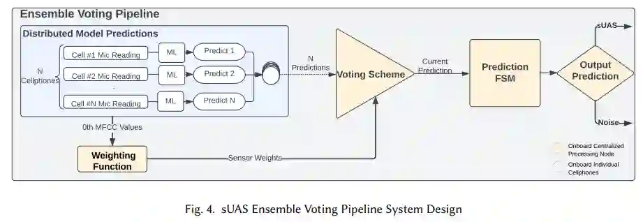 小型无人驾驶航空器系统(sUAS)是一种易于获取的技术,对美国关键系统的威胁越来越大。它们体积小、重量轻、难以探测,这使得小型无人机系统可以提供侦察、投放爆炸物,甚至撞击敏感目标。这种具有威胁性的技术要求使用容错、低成本、可更换和精确的传感资源,以应对无人机系统无处不在的特性。因此,本文开发的方法是利用手机等可获取的传感资源来探测和跟踪 sUAS。这项研究工作源于空军研究实验室(AFRL)的一次数据收集,在这次数据收集中,无人机飞越了记录时间戳声学数据的手机群。在第一项工作中,开发了一种基于声学传感器网络的 SUAS 检测方法。该方法使用一个集合表决管道(EVP),融合来自分散在机场各处的 28 部手机的时间同步、低保真声学数据,以做出实时无人机探测决策。这项工作在模拟测试场景中实现了 0.846 的探测 F1 分数。该管道的性能还优于传感器网络中每部手机对无人机的检测性能,后者的平均检测 F1 分数为 0.582。