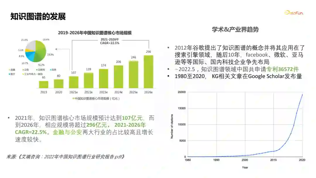 1.知识图谱的发展根据《艾瑞咨询:2022年中国知识图谱行业研究报告》,2021年,知识图谱在国内的核心市场规模预计达到百亿元级别。到2026年,相应规模将超过296亿元,每年复合增长率超过20%。其中金融和公安两大行业的占比较高而且增长的速度更快一些。 在学术和产业界,自从2012年谷歌在搜索领域提出了知识图谱的概念并应用之后,随后的10年时间,国内外科技公司在知识图谱包括图数据库和图计算上都争先布局。从谷歌学术发表的知识图谱文章来看,最近5到10年时间,越来越多的技术人员投入到知识图谱领域研发中。