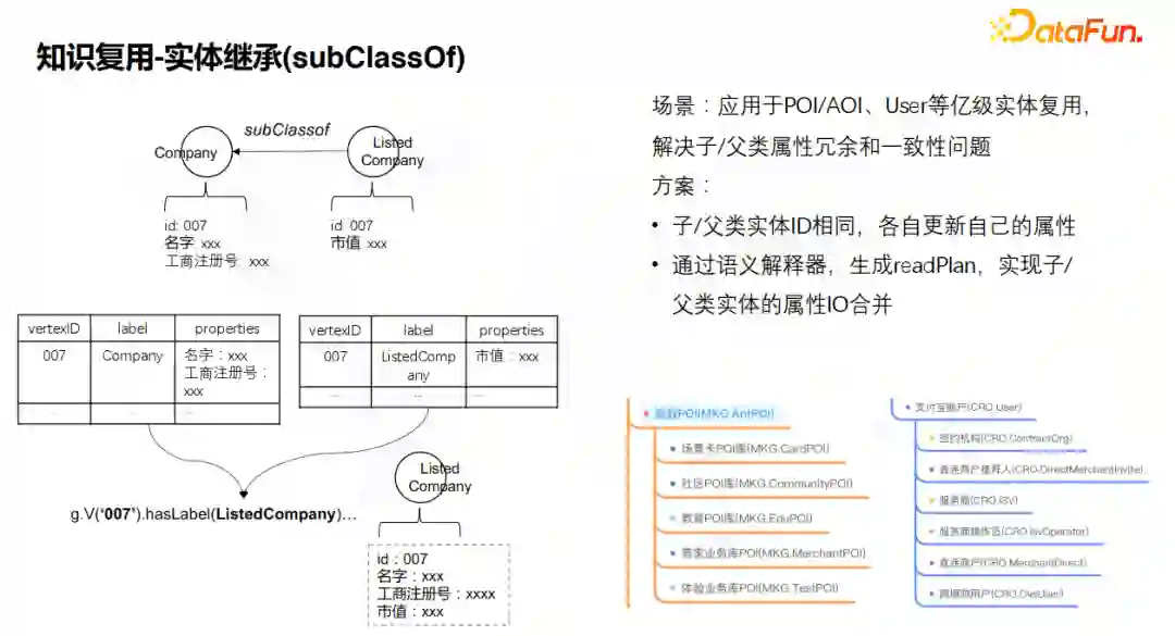 实体继承是语义知识复用的一个非常典型的场景。在蚂蚁的内部场景中,我们的POI/AOI,支付宝用户等亿级别的实体复用,已经用到了实体继承。实体继承类似面向对象的继承概念,比如一个公司实体,它有一些通用属性。而在这个公司上面还有上市公司,上市公司会有市值等特有属性信息。实体继承就是要解决子父类属性的冗余和一致性问题,即通过一种方案,使得查询或者推理在获取子类属性的时候,能够动态拼接父类的属性。我们的解决方案首先是子类和父类实体的ID相同,各自属性保持独立更新和互为索引。然后在读取端通过语义解释器,生成readPlan,实现子父类实体的属性动态IO合并。