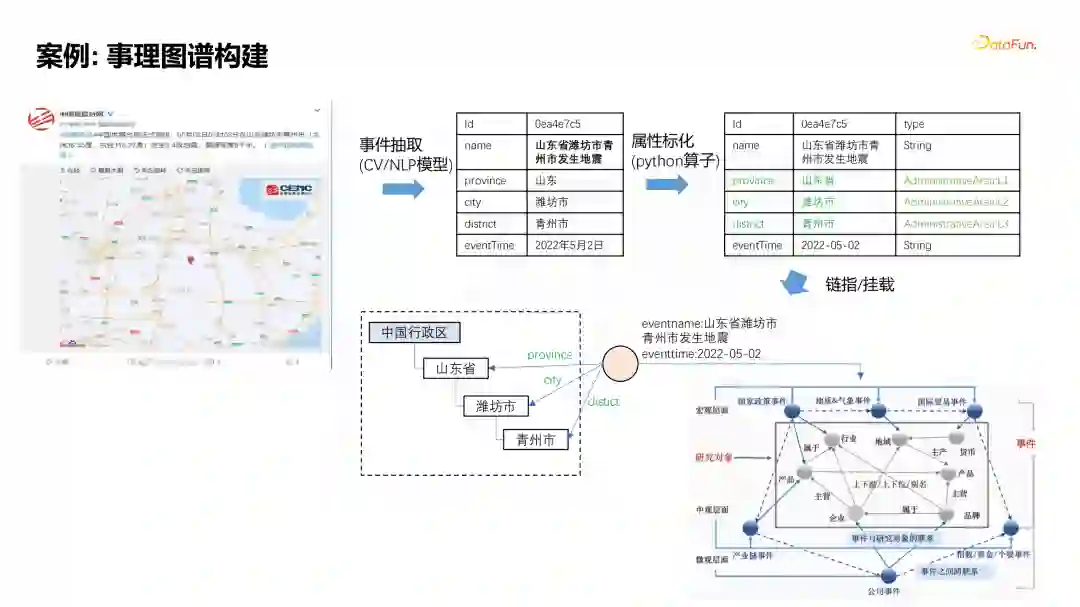首先我们从中国地震台网发布的一则地震新闻信息,通过NLP模型进行事件抽取,抽取得到地震事件发生的地理位置和时间等关键要素。通过属性的标准化,可以把地震事件的地理位置标准化,归属到相应的省市区,然后和中国行政区的标准概念网络进行关联。同时,这个事件也会归属到事件分类的概念网络里面,比如它属于这个地域的事件,或者是气象的事件。这样的好处就是通过这个地震事件,关联到周边的一些房地产企业,地震事件对它们的经营产生影响,从而有利于支撑我们对这些企业进行风险评估。