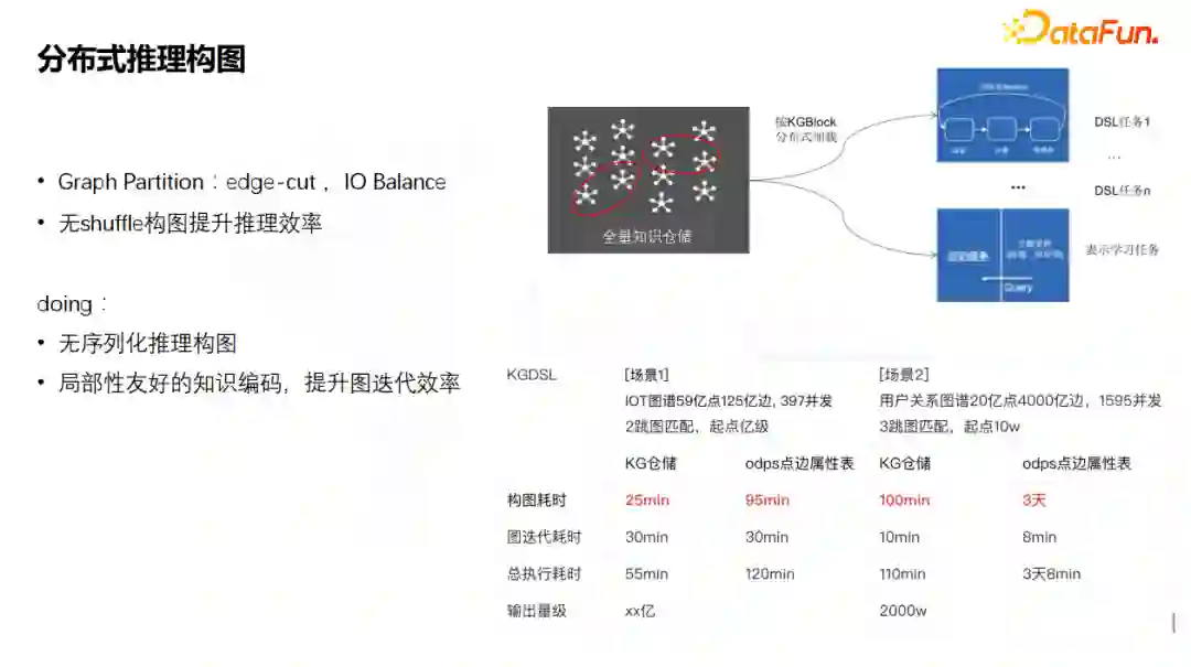分布式知识推理过程基于图计算引擎实现,整个推理的流程包括构图和图迭代两个部分。我们采用图表示的存储模型,能更高效对接GeaFlow等图计算引擎,实现无shuffle构图,提升推理效率。测试表明,我们现在的这种知识管理方案,比以前直接基于table的关系模型,实现了构图效率的大幅提升。后续我们也会和TuGraph团队合作,更好地实现引擎衔接,做到无序列化推理构图。另外我们也在探索局部性友好的知识编码,提升图迭代效率。