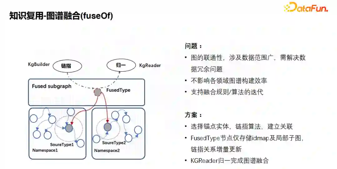 图谱融合是知识管理的一个难点,也是非常重要的业务场景。图谱融合简单来说就是把两个领域的图谱通过某种方式融合到一起,实现两个领域的图谱互通,解决数据孤岛问题。由于图本身的连通性,实现两个图谱融合,涉及的数据范围非常广,所以首先要解决数据冗余的问题。我们把图谱融合分成两个阶段,第一个阶段叫做链指,第二个阶段叫做归一。链指是指在两个不同的领域图谱里面选择一个锚点实体,通过链指算法建立这个锚点实体的关联。归一是指对这个锚点实体对应的子图信息进行合并的过程。如果把归一的过程放在构建端,每一次锚点实体的更新,都会触发图数据的归并,这个成本非常高。因为一个点关联的周边关系或者一度子图,可能是非常庞大的。所以我们在构建融合实体的时候,都是把它作为一个虚拟的实体存在,仅存储链指的idmap和它的局部子图信息。更重要是融合算法或者规则发生更新的时候,链指关系的变化只会触发增量更新,更好地适应算法的迭代。