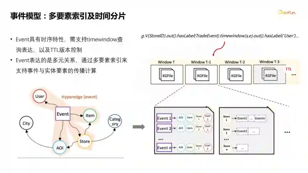 事件模型的实现有两个比较关键的要求:一是事件具有时序特性,一般需要支持时间窗口查询表达,以及TTL版本控制能力。比如通过时间的分片,把所有数据按时间切割成不同的分片,从而提升构建或者推理的效率。二是事件表达的是多元的关系,需要通过多要素索引支持事件与实体要素的传播计算。比如线下购买事件,通常会关联到一个用户、一个商品,也会关联到一个商店和它的地理位置信息。这和传统的pairwise二元关系还是有区别的。为了实现事件到实体要素之间的传播,我们需要构建它的多维索引,包括事件关联的实体要素索引,以及实体要素到事件的索引。