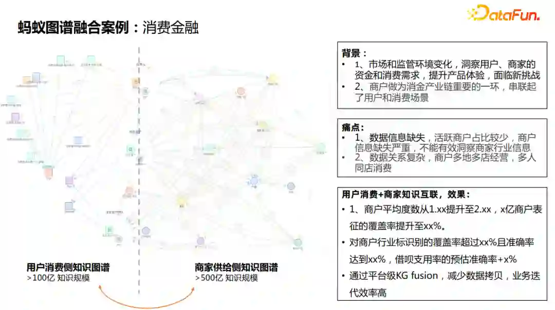 我们举一个金融消费的例子解释蚂蚁知识图谱的融合场景。在这个例子里,我们有两个不同领域的图谱,一个是用户消费侧的知识图谱,另一个是商家供给侧的知识图谱,两个都是数百亿的知识图谱。消费侧知识图谱关注消费的场景信息,供给侧知识图谱关注的是商家的品牌、类目、门店以及地理位置等信息。通过把用户或者商户作为锚点实体就可以建立两个图谱之间的零拷贝关联。商户作为消费金融产业链重要的一环,串联起了用户和消费场景。通过关联,这样围绕商户的关系就更加丰富,表征能力更强,提升了商户的画像刻画能力。