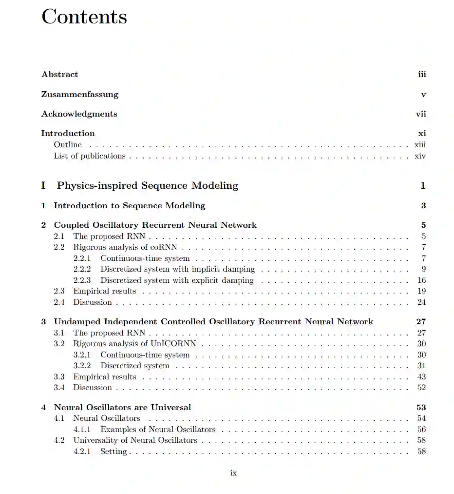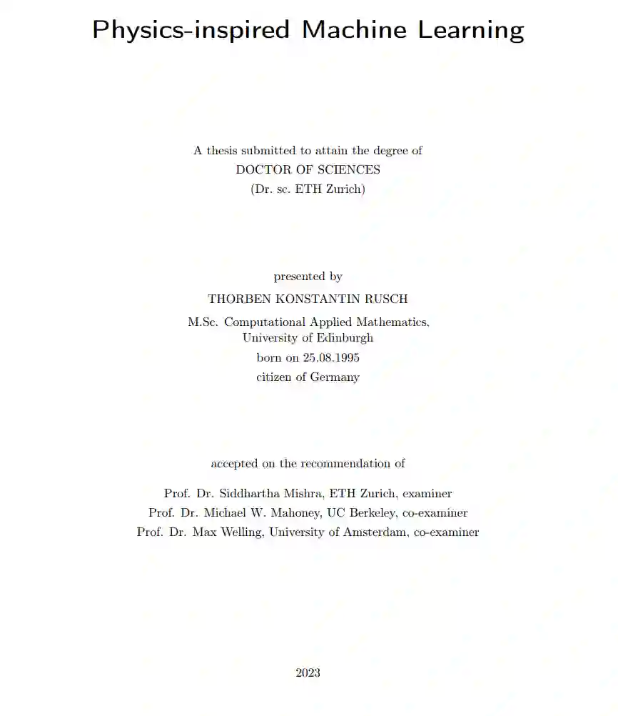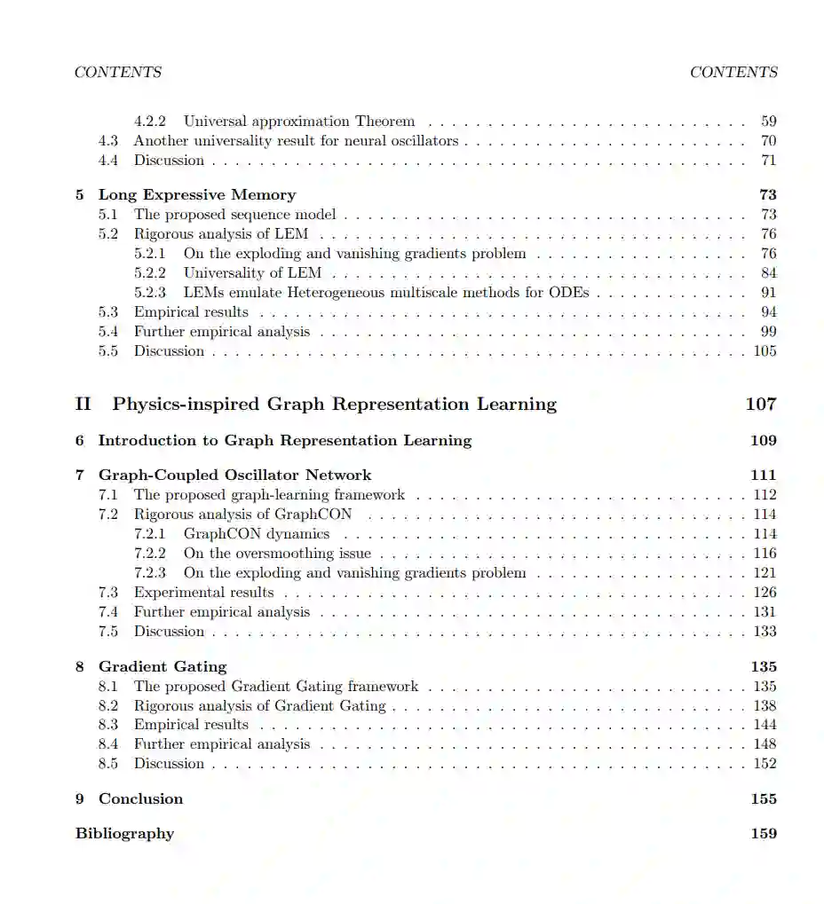 对于神经网络的物理启发归纳偏见并不局限于物理科学中的应用。相反,最近的物理启发机器学习方法在深度学习的许多传统领域都有应用。例如在生成建模中,扩散模型[Yang等人,2022]是最先进的。这些模型利用一个物理过程,即扩散,逐渐地用随机噪声损坏输入数据。一旦训练完成,新数据可以通过反转扩散过程生成。由于这种方法基于物理过程,所以在这个背景下的许多模型从物理系统中获得启示,以构建具有更好的归纳偏见的扩散模型[Dockhorn等人,2021, Lai等人,2022, Salimans和Ho,2021]。另一个例子包括图表示学习,其中越来越多使用物理启发的图神经网络(GNNs)。例如,在基础GNN操作(所谓的消息传递[Bronstein等人,2021])中引入各向异性扩散[Chamberlain等人,2021b]、渐变流[Di Giovanni等人,2022]、反应-扩散方程[Choi等人,2022]或双曲偏微分方程(PDEs) [Eliasof等人,2021],仅举几例。 在这篇论文中,我们提供了几个最早的基于物理启发的机器学习模型的例子。更具体地说,我们提供了由非线性耦合振荡器系统、(时依赖的)哈密尔顿系统和多尺度动力系统启发的循环序列模型。我们随后展示了这些模型,由于其基于物理的归纳偏见,展现出了非常有利的特性,例如处理序列数据中的长期相互作用,或者在真实世界的数据集上提高表现力。此外,我们提供了基于图表示学习的物理启发模型,这些模型受到图-动力系统的启发,即图-耦合振荡器以及多速率图-动力系统。我们进一步为这些模型证明了各种有益的特性,例如使用GNNs的图表示学习中的中心问题,即过度平滑[Nt和Maehara,2019, Oono和Suzuki,2020],以及处理异性(大规模)图数据集。