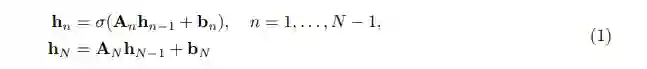 对于所有的层 n = 1, . . . , N,其中隐藏状态为 hn ∈ R^mn,权重为 An ∈ R^mn×mn−1,偏差为 bn ∈ R^mn,初始输入由 h0 = u 给出(即,m0 = d 是输入维度),并且σ表示一个非线性激活函数,例如 tanh(x) 或 relu(x) = max{0, x} 对于 x ∈ R,这是逐元素应用的。深度神经网络(1)可以通过定义一个适当的损失函数来训练,该函数测量神经网络的输出 hN 与真实数据之间的差异,然后应用基于损失函数相对于神经网络(1)的参数 {An, bn}^N_n=1 的梯度的梯度下降方法(例如随机梯度下降[Robbins 和 Monro, 1951])。因此,梯度是使用反向传播算法有效地计算的。
