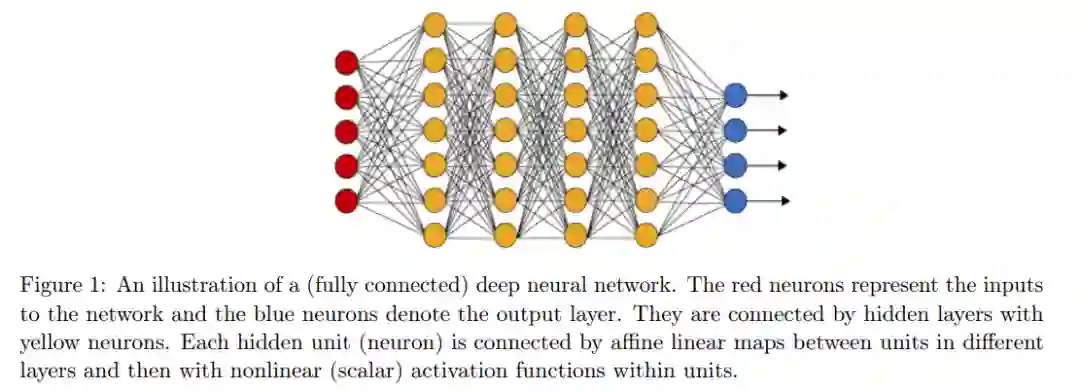 在科学和工程领域中,许多问题都需要理解和建模可能的大量测量数据。典型的例子包括在物理约束下的工艺设计(例如,优化飞机翼上的升力和阻力以适应不同的运行条件)、气候模拟(例如,计算由于不同的CO2排放水平导致的全球平均海表温度)和新药设计(例如,利用已知活性结合剂的数据洞察来形成一个配体药效团模型以推断新的结构),仅举几例。因此,已经有了一长串用于模式识别和数据驱动建模的多功能方法。早期的例子包括支持向量机[Steinwart和Christmann, 2008]、常规核方法[Shawe-Taylor等人, 2004]、聚类算法[Xu和Wunsch, 2005],以及贝叶斯方法用于概率推理[Box和Tiao, 2011]。虽然人工神经网络已经存在了很长时间,可能在其非常简单的线性回归形式(也称为最小二乘法)中存在了几个世纪,但它们目前的广泛使用主要是由于可以有效地计算它们相对于可训练参数的梯度(即反向传播算法[Rosenblatt, 1961, Rumelhart等人, 1985])和可用的计算资源数量呈指数增长。特别是后者使得可以在大型数据集上训练更深入的模型,即,堆叠在彼此之上的多层人工神经网络,这一领域被称为深度学习[Goodfellow等人, 2016]。 深度学习现在是机器学习中最受欢迎的方法之一,对计算机科学和工程的整个子领域产生了深远的影响,如计算机视觉、自主系统和机器人技术、自然语言处理(NLP)和语音识别。深度学习的核心是深度全连接前馈神经网络(也称为多层感知器 [Rosenblatt, 1961, Werbos, 1982, Rumelhart等人, 1985]),它可以描述为多个(因此被称为“深度”)仿射变换的串联,与逐元素的非线性激活函数交替出现。更具体地说,考虑一个输入 u ∈ R^d 。一个具有N ∈ N层的深度全连接前馈神经网络(图1)可以被简洁地写为: