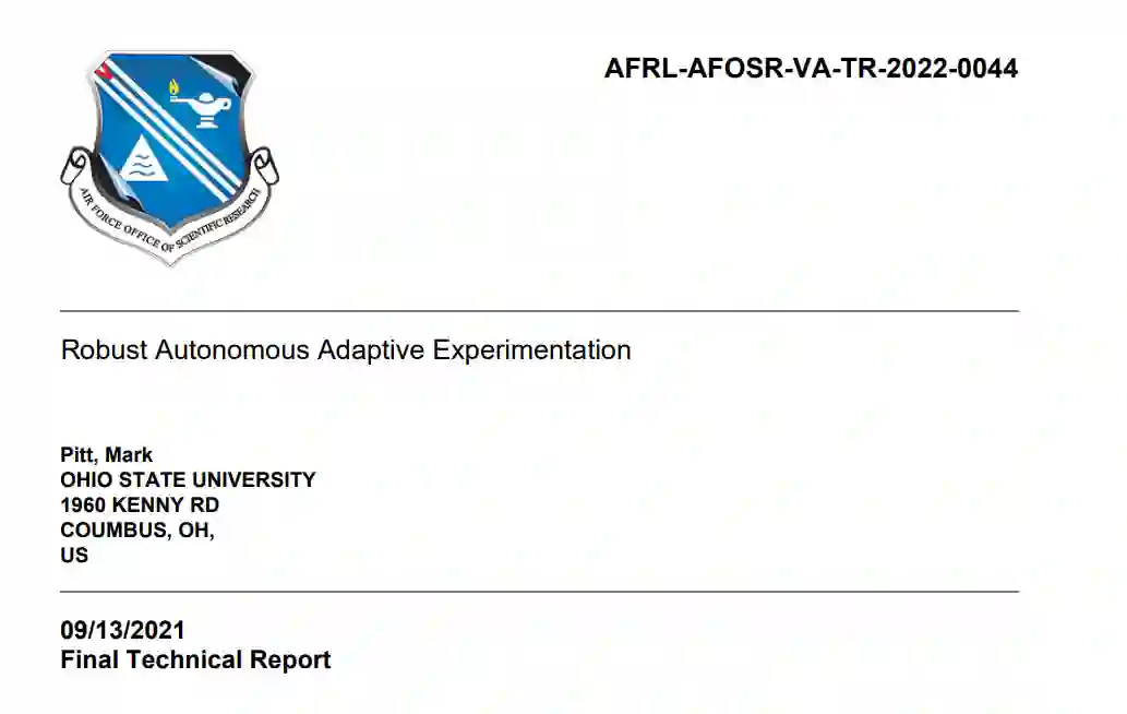 提出了四个具体目标,以开发、实施和实证验证用于认知科学和材料科学领域自主自适应实验的贝叶斯学习算法。目标 1 和 2 侧重于算法开发,通过使用以下三种算法实施鲁棒自适应系统(RAAS,即实验框架)来实现:(1) 自适应设计优化(ADO,基于模型的算法,目标 1);(2) 贝叶斯优化(BO,无模型算法,目标 2);(3) 高斯过程主动学习(GPAL),第二种完全由数据驱动的无模型优化实验设计方法。目标 3 测试了 ADO 和 GPAL 在决策和数值估计领域的应用。目标 4 测试了如何利用 BO 改善碳纳米管的生长并提高 3D 打印的精度(目标 4 是与美国空军后勤部材料与制造局的 Benji Maruyama 博士合作完成的)。在所有应用领域,都成功证明了这些算法在实现研究目标方面的稳健性和高效性。这项工作推动了认知科学和材料科学领域自主研究的最新进展。