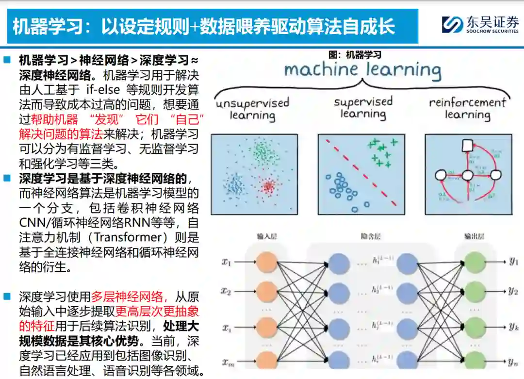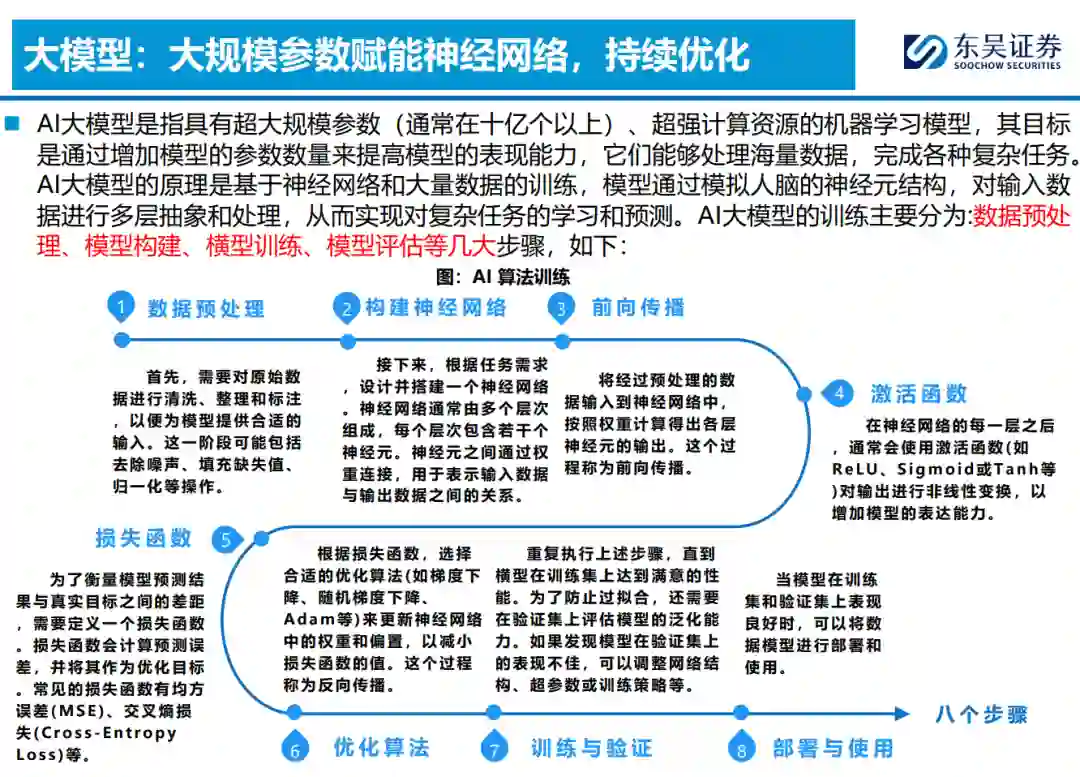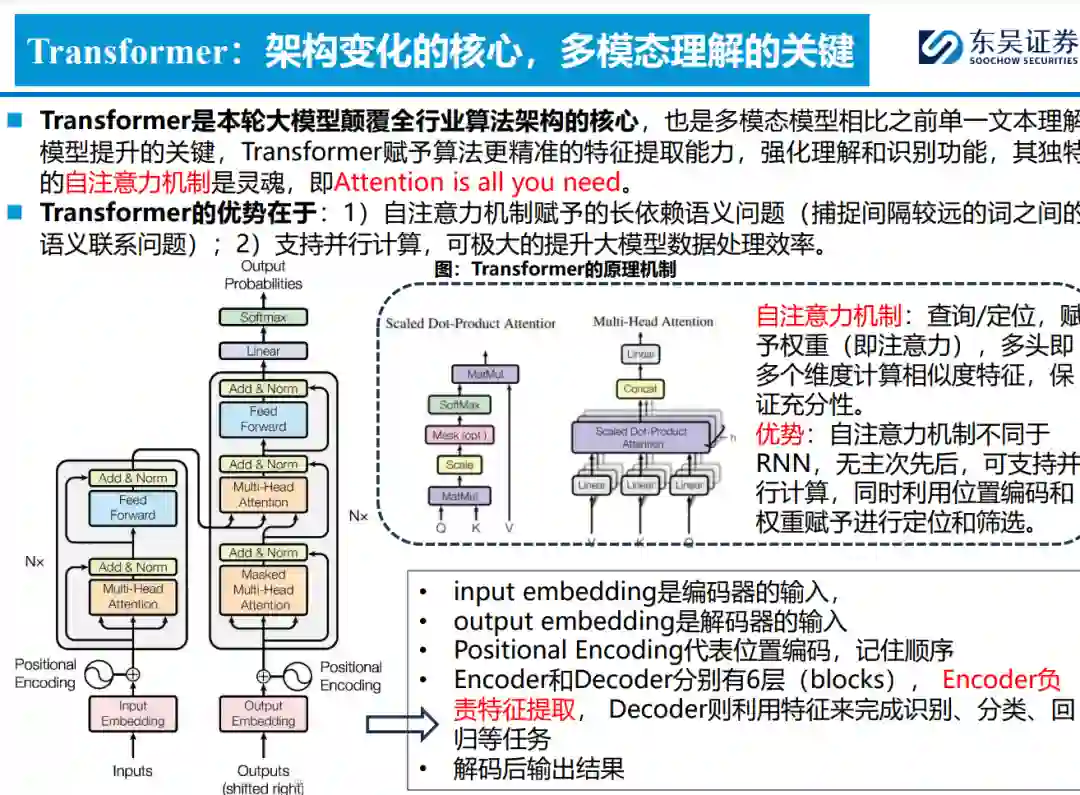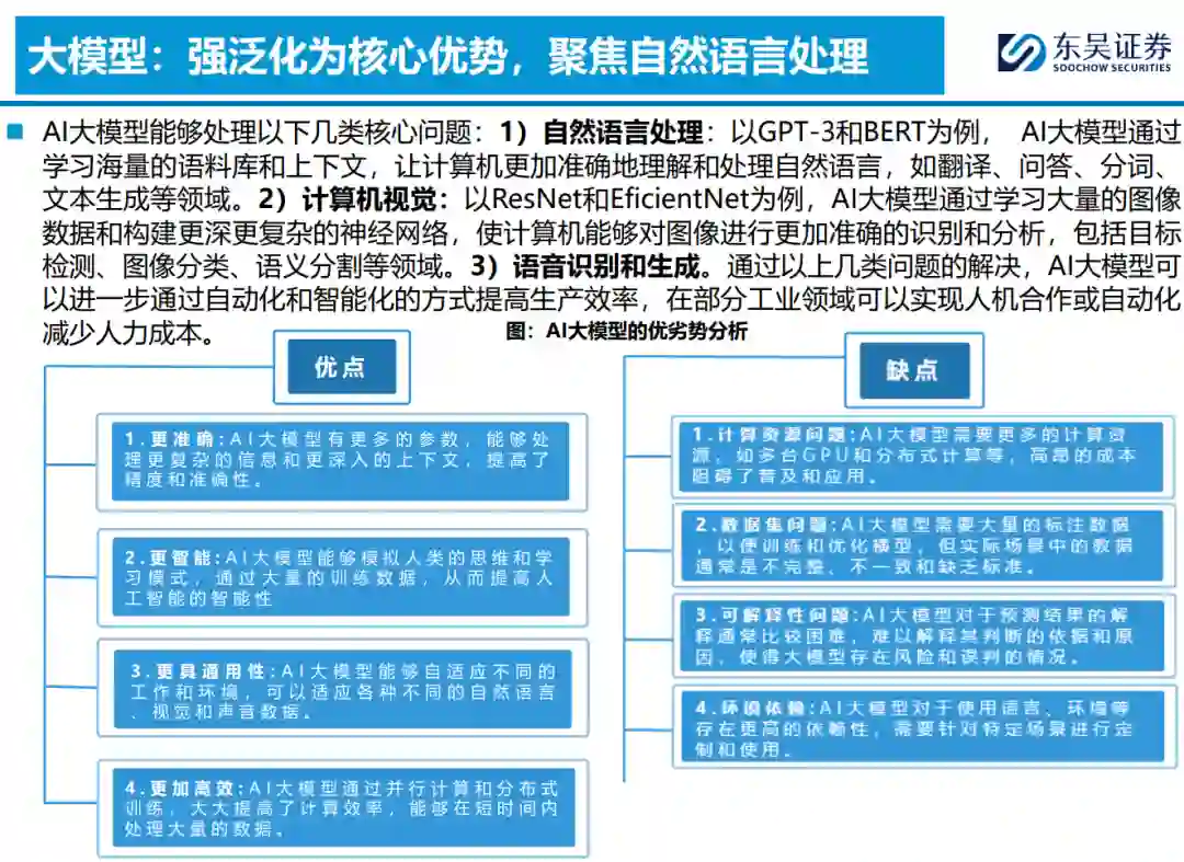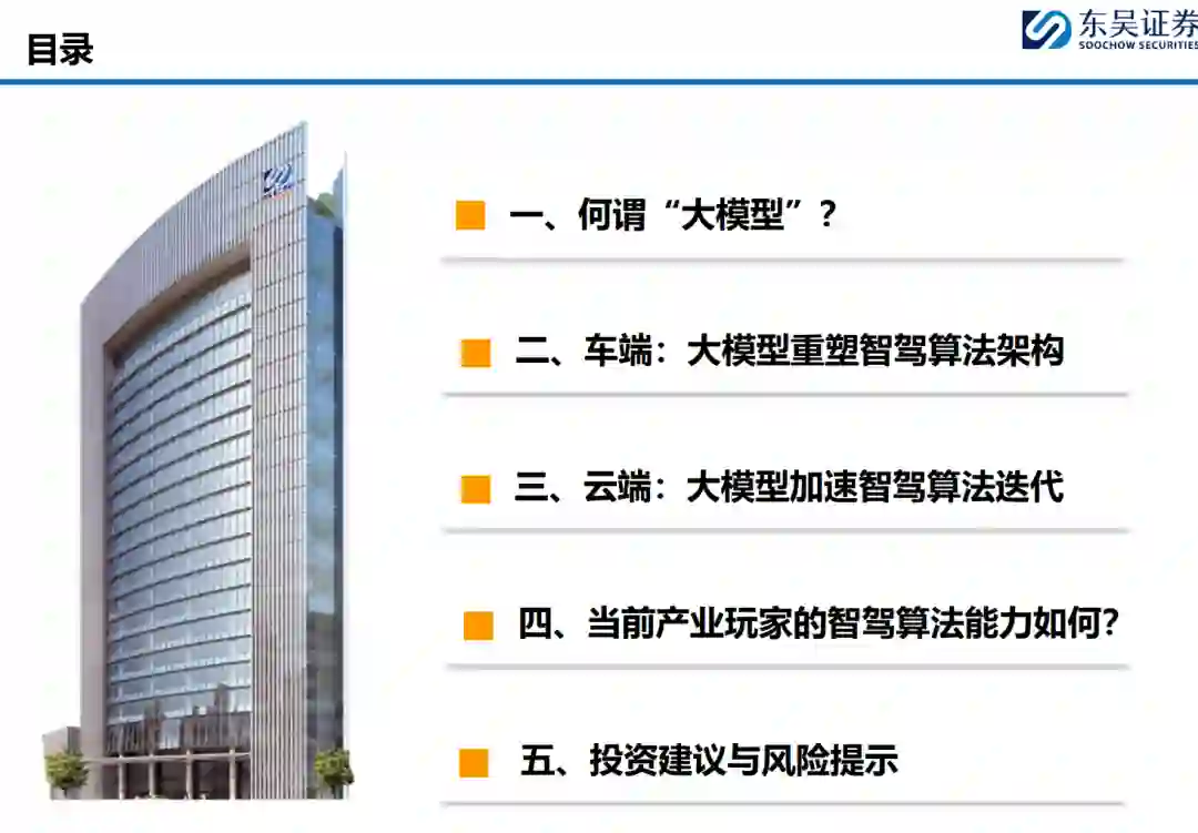 何谓“大模型”?大数据喂养神经网络算法,设定规则机制使其自成长。1)多模态数据是基础, 包括文本/图像/音频/视频等在内的多类型数据喂养,驱动算法更好完成理解/生成等任务。2) Transformer是核心,Self-Attention机制强化算法抽象特征提取能力,并支持并行计算,高能 且高效,衍生ViT/DiT支持多模态数据理解/生成。3)ChatGPT及Sora为代表应用,在大参数加 持下,开发多模态自然语言处理以及文生视频等功能。4)世界模型为未来方向,算法能力由数据 驱动演变为认知驱动,模型具备反事实推理和理解物理客观规律的能力,提升通用泛化特性。 ◼ 大模型重塑车端算法架构,加速云端算法迭代;世界模型或为完全自动驾驶最优解。智驾一阶段 (L2~L3)脱胎换骨:由场景驱动转向数据驱动,大模型带来底层架构质变;智驾二阶段 (L3~L4)厚积薄发:由数据驱动转向认知驱动,数据和算力逐步累计驱动能力提升,量变引起 质变。1)车端:上层感知/规控应用层算法随功能需求提升持续进化,“场景理解处理能力泛化”是核心诉求。L2~L3,感知端为升级核心,Transformer加持BEV+占用网络算法落地感知端到端,解决长尾场景识别难题;L3~L4以规控算法升级为核心,精准识别并快速处理,Learning-base 逐步取代Rule-base,端到端拉高场景处理能力的天花板。2)云端:数据闭环为前提,加速大数 据有效利用,采集/标注/仿真/训练/部署一体化。Transformer赋能自动标注,数据驱动场景仿真 泛化,降低对有限的实际路测数据的依赖。3)世界模型【通用具身智能】或为自动驾驶最优解。 车端场景生成泛化,将自动驾驶问题转化为预测视频的下一帧,类人模式处理,实现泛化至数据 场景以外的能力;并可快速生成标准化仿真数据,结合大算力加速云端训练。 ◼ 算法实现高壁垒+数据闭环硬要求,未来智驾算法产业格局趋于集中化。当前下游L3+高阶算法方 案以OEM自研为主,华为以“算法赋能,数据回传”的形式深度绑定OEM;L3以下算法呈现 OEM+独立算法商+硬件商三足鼎立格局。我们认为,考虑高阶智驾功能的提升对于算法能力/组 织架构/超算中心/完整数据链等的要求,未来“掌握硬件的基础上去发展软件”或为主流,即掌 握壁垒最高的硬件——芯片;提供性价比最高的硬件——传感器;掌握粘性最强的硬件——整车。