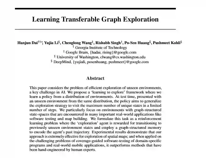 论文摘要: 本文考虑了对未知环境进行有效探索的问题,这是人工智能的一个关键挑战。我们提出了一个“学习探索”框架,可以从各种环境中学习政策。在测试时,由于存在来自相同分布的未知环境,该策略旨在推广探索策略,以有限的步骤访问最大数量的唯一状态。我们特别关注在许多重要的实际应用程序(例如软件测试和地图构建)中遇到的具有图结构状态空间的环境。我们将此任务表述为强化学习问题,其中“探索”特工因过渡到以前未见过的环境状态而受到奖励,并使用图形结构化的内存来编码特工的过去轨迹。实验结果表明,我们的方法对于探索空间图非常有效;并且当解决领域特定程序和实际移动应用程序的覆盖率指导的软件测试所面临的挑战性问题时,它的性能要优于人类专家人工设计的方法。