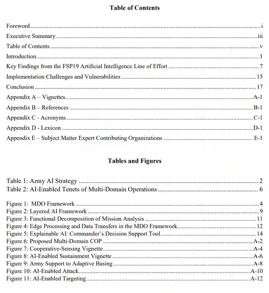 该报告支持美国陆军人工智能任务组,该组织负责制定陆军的人工智能战略和政策。本文通过描述部队如何在整个MDO框架内采用人工智能解决方案和相关技术,启动了陆军的人工智能运用工作。这份报告使概念发展团体能够修改陆军功能概念和战场发展计划。它为能力发展团体提供了作战视角和部队在确定所需能力时必须考虑的技术影响。此外,该报告还为作战概念文件或基于能力的评估提供了开发情景或小插曲的基础。该文件为科学和技术界提供了行动背景,以便为人工智能研究、开发、建模和模拟提供信息和指导。最后,它支持制定一个在未来使用人工智能的全面愿景,以告知陆军现代化的努力,这将创造有能力的MDO部队,准备好与任何对手作战并取得胜利。