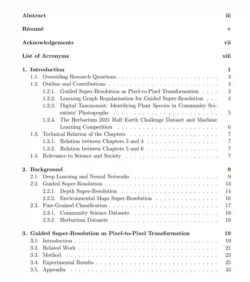 计算机视觉系统自从分类手写数字的时代以来取得了巨大的进步。特别是,监督学习已经成为解决科研之外任务的普遍方法。这些系统被部署在从自动驾驶汽车到自动医疗诊断和天气预报等多个行业的众多产品中。这些进步可以归因于深度学习算法、专业库和专用硬件的进步,以及用于模型训练的大型标注数据集的增加。然而,仍然存在一些任务,其中仅仅捕获和标注更多数据的标准范式并不是一个可行的解决方案。 在这篇论文中,我们调查如何最好地利用多模态数据来解决获取足够质量或完整性数据困难的计算机视觉任务。我们专注于两个特定任务:引导式超分辨率和细粒度分类。引导式超分辨率涉及通过将低分辨率数据与辅助模态结合来进行放大,而细粒度分类需要利用边际信息,使分类算法能够捕捉到细粒度类别之间细微的外观差异。最初,我们在缺乏地面真实数据的情况下为引导式超分辨率提供解决方案。首先,我们提出了一种将引导式超分辨率视为学习从引导到源域的像素到像素映射的新颖无监督公式。我们使用多层感知器参数化来保留高频细节。其次,我们提出了一种新颖的混合模型,以在保持解决测试时优化问题的严谨性的同时,最好地利用深度学习方法。关键是一个可微分优化层,它作用于一个学习的亲和图,确保目标对源的高保真度,因此对未见域具有高泛化性。随后,我们提出了一种自动识别社区科学家照片中细粒度植物标本的统一方法。该方法旨在利用社区科学家观察中通常可用的各种先验知识,包括地理和时间背景以及植物分类学,以学习跨类似物种的可转移表示。最后,我们提出了2021年半地球植物标本馆数据集,这是我们作为机器学习竞赛的一部分创建的一个大型策划和开放获取的植物标本数据集,以鼓励进一步研究从照片中自动识别细粒度植物物种。 近年来,计算机视觉领域取得了显著进步。当然,这些进步可以归因于深度学习研究、专业库和专用硬件的进展,但最重要的是,这些进步得益于大量数据的可用性,例如像ChatGPT(OpenAI,2022年)和Stable Diffusion(Rombach等,2021年)这样的生成模型分别在互联网上爬取了数十亿的文本和图像进行训练。 然而,并非所有任务都能使用现成的互联网规模数据集来解决。许多重要问题,如自动检测恶性肿瘤、评估自然灾害造成的损害或绘制濒危物种的地理分布,仍然是放大数据收集不是解决方案的挑战。这些挑战可以大致分为两类。首先,由于传感器捕获它们的固有技术限制,感知特定模态存在困难,例如遥感器如航空或卫星成像或主动传感器如激光扫描仪、ToF相机或MRI扫描仪。其次,观察罕见事件或特定数据类型的多样性困难,因为在现实世界的数据收集工作中不经常遇到某些场景或类别。例如,捕捉所有容易发生事故的驾驶场景,或收集所有生物物种的足够数据就是这种情况。