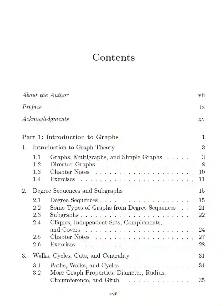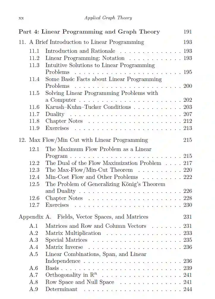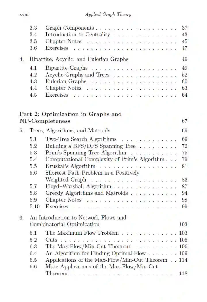 这本书作为图论及其应用的引介而编写。它是为高年级本科生的图论课程设计的,但也适用于科学或工程专业的初级研究生。该书严格(基于证明)地介绍了图论,同时也讨论了利用这些结果解决实际感兴趣问题的应用。本书分为四个部分。 第一部分涵盖了图论的组合方面,包括常用词汇的讨论、顶点和边割的讨论、欧拉游览、哈密顿路径以及树的表征。这导致了第二部分,该部分讨论了常见的组合优化问题。生成树、最短路径问题和拟阵都有讨论,最大流问题也是如此。第二部分以图着色和着色问题的NP完全性证明作为结尾。 第三部分向读者介绍代数图论,并重点讨论马尔可夫链、中心性计算(例如,特征向量中心性和页面排名)以及谱图聚类和图拉普拉斯算子。 第四部分包含了关于线性规划的额外材料,用于提供最大流问题的另一种分析。还提供了两个附录,其中包含了线性代数和概率论的先决条件材料。