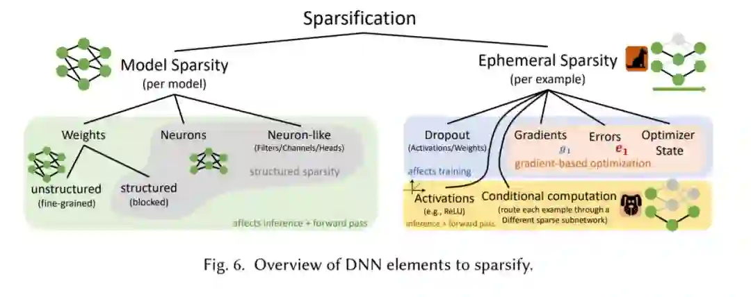 深度学习不断增长的能源耗费和性能成本,促使社区通过选择性修剪组件来减少神经网络的规模。与生物学上的相似之处是,稀疏网络即使不能比原来的密集网络更好,也能得到同样好的推广。稀疏性可以减少常规网络的内存占用,以适应移动设备,也可以缩短不断增长的网络的训练时间。在本文中,我们调研了深度学习中的稀疏性之前的工作,并为推理和训练提供了一个广泛的稀疏化教程。我们描述了去除和添加神经网络元素的方法,实现模型稀疏性的不同训练策略,以及在实践中利用稀疏性的机制。我们的工作从300多篇研究论文中提炼思想,并为希望利用稀疏性的实践者提供指导,以及为目标是推动前沿发展的研究人员提供指导。我们在稀疏化中包括必要的数学方法背景,描述诸如早期结构适应、稀疏性和训练过程之间的复杂关系等现象,并展示在真实硬件上实现加速的技术。我们还定义了一个修剪参数效率的度量,可以作为不同稀疏网络比较的基线。最后,我们推测稀疏性如何改善未来的工作,并概述该领域的主要开放问题。