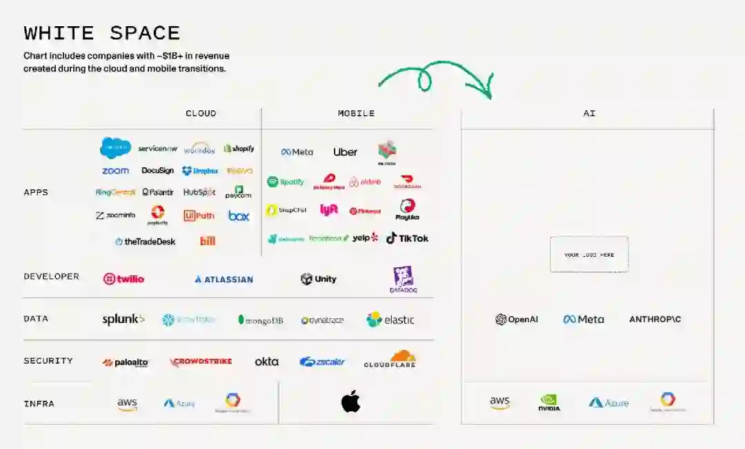 投资方向的分析:各层面的机遇与挑战 作为全球著名风投公司,红杉资本更关注哪里?资金被投入到哪里? * 基础设施:基础设施层面是超大规模企业的优势领域,对风险投资家来说不好。 * 模型:模型层面是超大规模企业和金融投资者的竞争领域。 * 开发者工具和基础设施软件:对战略投资者吸引力较小,对风险投资家较有吸引力。 * 应用程序:应用程序层面是风险投资者最感兴趣的,云过渡和移动过渡期间有应用层公司年收入超 10 亿美元,预计 AI 领域也会如此。