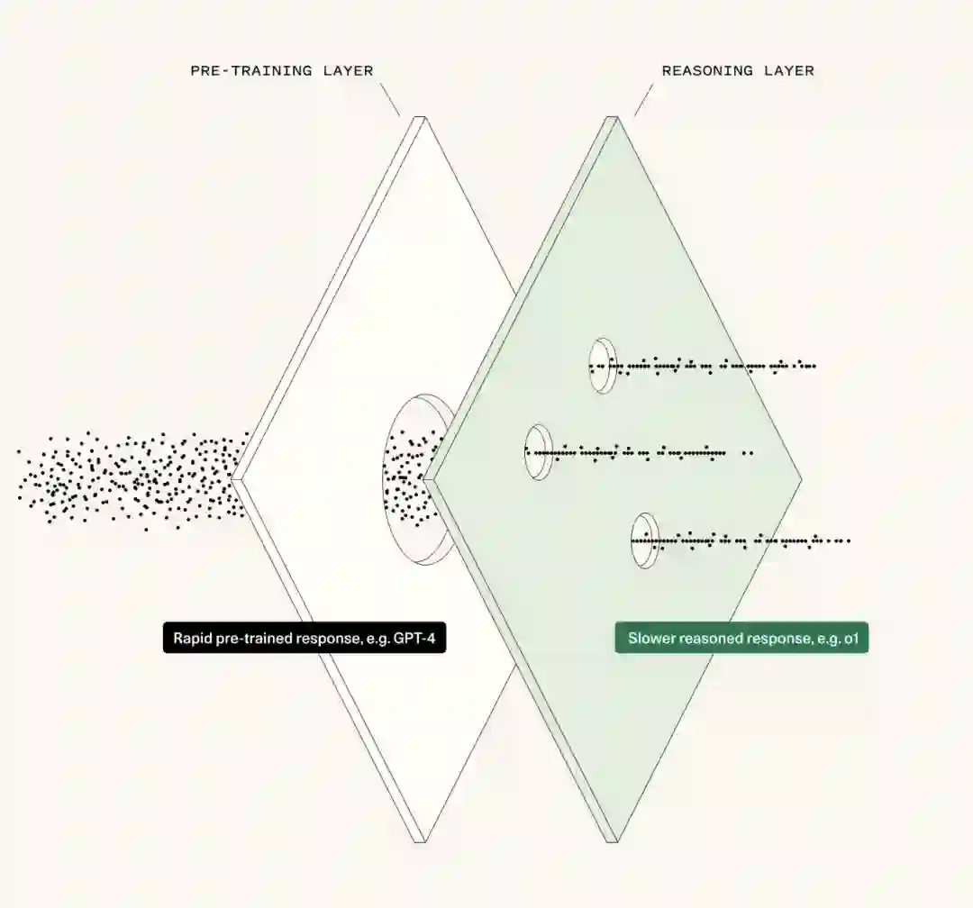 AI 思维模式的转变:从系统 1 到系统 2 及新扩展法则 AI 正从简单的预训练反应(“系统 1”)向更深层次的更加深思熟虑的推理(“系统 2”)转变。 系统 1 依赖模式模仿,不论是 AlphaGo 通过围棋的数百万步训练出的技能还是大语言模型通过大量的互联网文本进行预训练所训练出的语言能力。但是,模仿,尽管强大,却不是真正的推理。 面对复杂新问题,系统 2 的深度推理至关重要。它要求 AI 探索多种可能,评估结果并基于逻辑推理决策,以应对复杂问题。