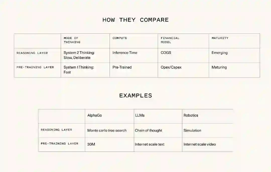 生成式 AI 的发展:从 “快思考” 到 “慢思考”,开启自主应用的新篇章。 在生成式 AI 革命的两年里,研究方向正从 “快思考”(快速预训练响应)向 “慢思考”(推理时的深度思考)转变。这种转变是因为市场基础层已趋于稳定,像微软 / OpenAI、AWS/Anthropic 等巨头形成了竞争格局。 随着大模型市场结构趋于稳定,下一个重点领域正在浮现:焦点正转向推理层的开发和扩展,“系统 2” 思维开始主导。