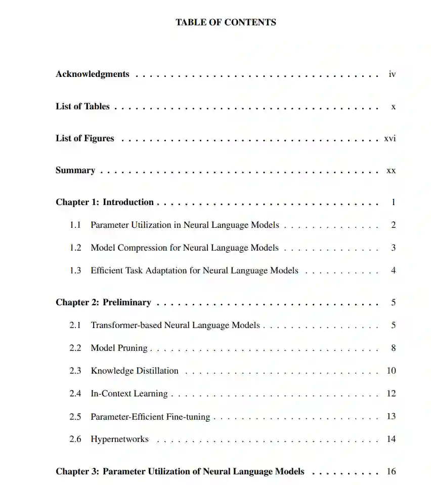 近年来,预训练的神经语言模型在各种自然语言理解和生成任务上取得了显著的能力。然而,将这些模型扩展到包含数十亿参数的趋势,虽然增强了适应性和新出现的能力,但也因其庞大的规模带来了显著的部署挑战。这些挑战包括对模型存储和实际部署的推理延迟的限制、任务适应所需的密集时间和计算成本,以及影响任务适应性的大量冗余参数的存在。受到这些挑战的驱动,本论文旨在提高这些模型的参数效率,寻求最小化存储需求、加速推理和适应,并增强泛化能力。
