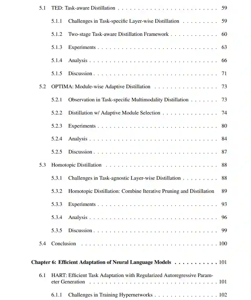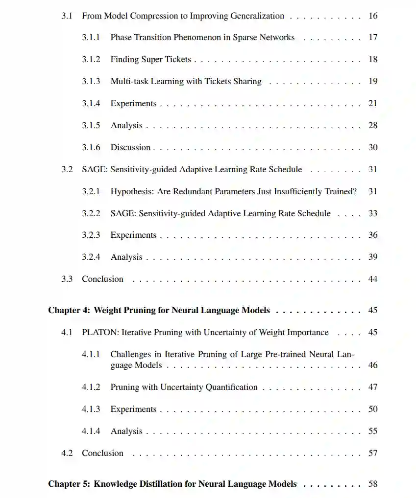 我们探索了模型压缩方法,包括权重修剪和知识蒸馏,以减少模型存储并加速推理。我们首先开发了一种可靠的迭代修剪方法,该方法考虑到训练动态中的不确定性。然后,我们深入探讨知识蒸馏领域,解决了常常阻碍学生表现的大教师-学生“知识差距”。为了解决这个问题,我们提供了两种解决方案,通过选择性地蒸馏与任务相关的知识来产生特定任务的学生。在需要学生跨多种任务适应性的情境中,我们提出通过结合迭代修剪和蒸馏来减少知识差距。我们的方法在相似的压缩比率下显著超过传统的蒸馏方法。 -- 神经语言模型中高效的任务适应