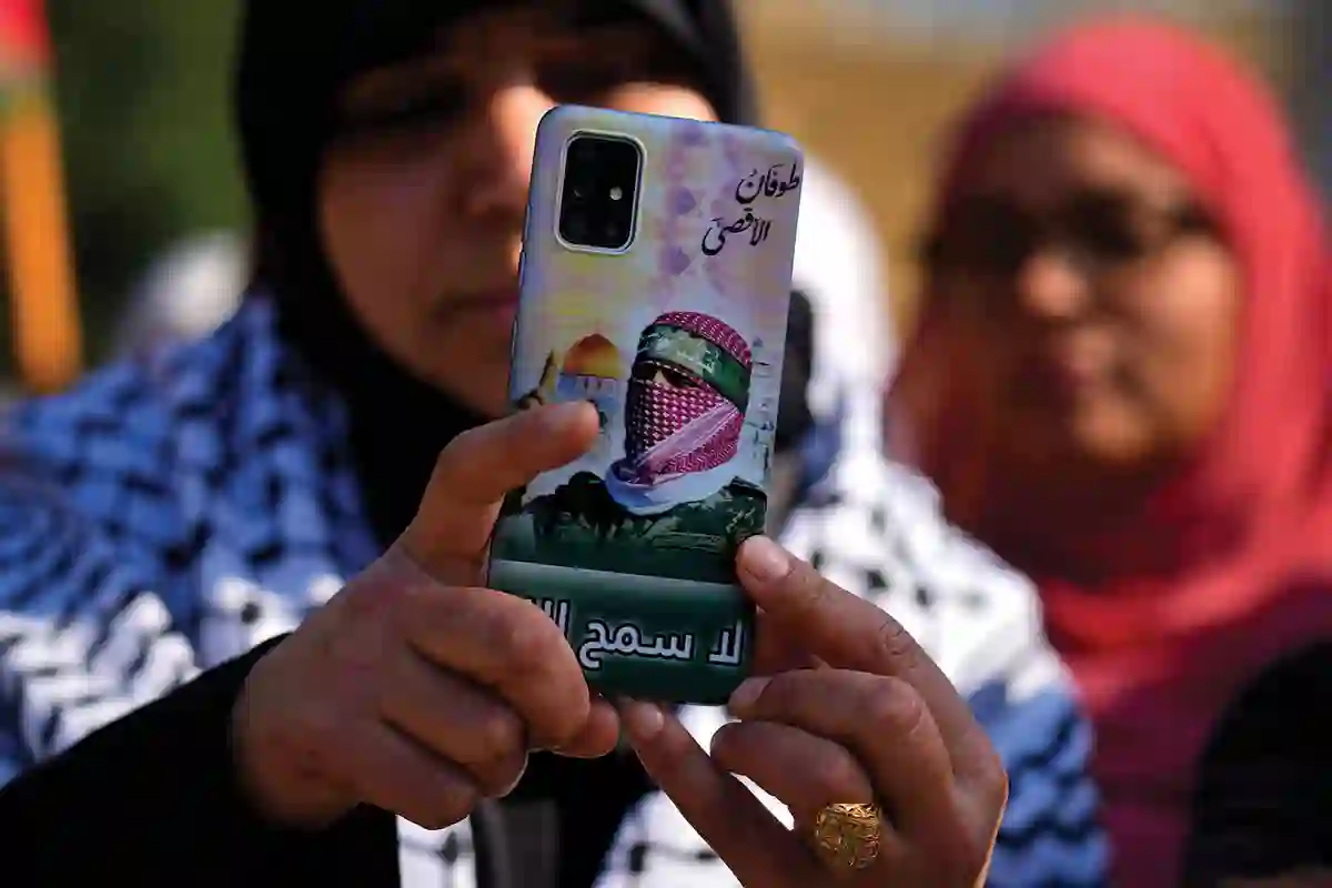 图:2024 年 2 月 11 日,一名示威者在贝鲁特联合国西亚经济社会委员会总部附近拍照,抗议要求停火并支持加沙地带的巴勒斯坦人。她的手机上贴着哈马斯卡萨姆旅发言人阿布-奥贝达(Abu Obeida)的照片。在当前的作战环境下,具有拍照功能的手机使世界上任何人都能绕过新闻业传统编辑审查的过滤,这在一定程度上保证了所传播的图像和事实得到准确报道并符合上下文。源自加沙冲突的未经过滤的信息大量涌入,使人们对事件的理解变得更加复杂,因为相互矛盾的叙述在全球范围内传播。