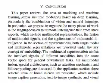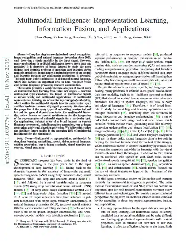 摘要: 自2010年以来,深度学习已经彻底改变了语音识别、图像识别和自然语言处理,每一项都涉及到输入信号中的单一模态。然而,人工智能中的许多应用都涉及到一种以上的模式。因此,研究跨多种模式的建模和学习这一更为困难和复杂的问题具有广泛的兴趣。本文对多模态智能的模型和学习方法进行了技术综述。视觉与自然语言的结合已成为计算机视觉和自然语言处理研究领域的一个重要课题。本文从学习多模态表示、多模态信号在不同层次的融合以及多模态应用三个新的角度,对多模态深度学习的最新研究成果进行了综合分析。在多模态表示学习中,我们回顾了嵌入的关键概念,它将多模态信号统一到同一向量空间中,从而实现跨模态信号处理。我们还回顾了为一般下游任务构造和学习的许多嵌入类型的特性。关于多模融合,本文着重介绍了用于集成特定任务的单模信号表示的特殊体系结构。在应用程序方面,涵盖了当前文献中广泛关注的选定领域,包括标题生成、文本到图像生成和可视化问题解答。我们相信,这项检讨有助于社区未来在新兴多模态情报领域的研究。