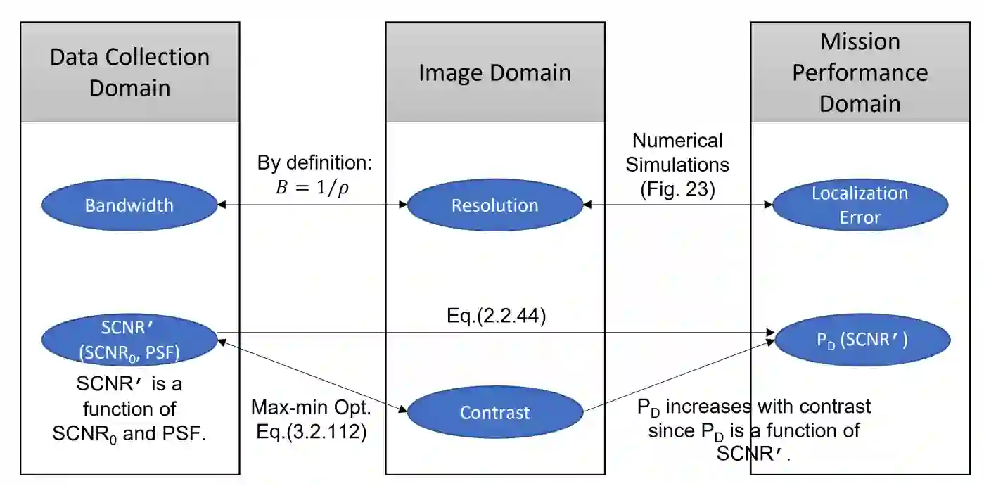 图 3 描述了双臂合成孔径雷达的数据采集、图像和任务性能领域之间基于性能指标的关系,第三章将对此进行讨论。在图 3 中,带宽和 SCNR0、分辨率和对比度、定位误差和探测概率 (PD) 分别指数据采集、图像和任务性能域的性能指标。本研究特别表明,检测概率(任务性能域)是 SCNR0(数据采集域)的函数。如图 3 所示,SCNR0(数据收集域指标)的增加意味着 PD(任务性能域指标)的增加。SCNR0 和带宽可以快速有效地选择发射器,而无需经过更复杂、更耗时的成像和任务分析过程。