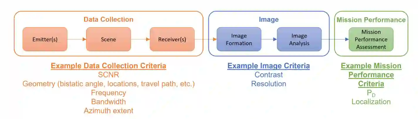 雷达可生成各种数据产品,包括合成孔径雷达图像和目标轨迹。产品的质量取决于雷达采集参数,如带宽、方位分集和信号杂波加噪声比(SCNR)。通常,雷达硬件将针对特定任务产品(合成孔径雷达、地面移动目标指示(GMTI)等)进行设计和广泛测试,以达到输出质量的最低要求。任务规划(飞行路径、运行参数等)会进一步调整硬件设计,以实现所需的性能。然而,对于无源雷达,只有接收机的设计受雷达工程师的控制。软件可调硬件为实时更新任务规划提供了灵活性,但还需要指标和算法来驱动这些更新。此外,对于无源雷达来说,选择最佳发射器是一项重大挑战,因此制定评估选择结果的性能标准至关重要。因此,本研究的目标是定义合成孔径雷达处理域并制定合成孔径雷达性能标准,以便为无源双稳态和多静态合成孔径雷达制定发射器选择问题,从而在确保任务成功的同时实现快速高效的优化。