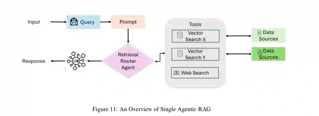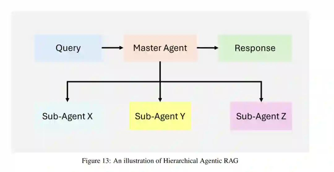 Agentic RAG系统可以根据其架构的复杂性和设计原则进行分类,主要包括单智能体架构、多智能体系统和分层智能体架构。每种架构都针对特定的挑战进行了优化,并在不同的应用中表现出色。4.1 单智能体Agentic RAG:路由器单智能体Agentic RAG系统采用集中式决策机制,由单个智能体负责检索、路由和信息的整合。这种架构简化了系统设计,特别适用于工具或数据源数量有限的场景。工作流程查询提交与评估:用户提交查询,协调智能体接收并分析查询,确定最合适的信息源。知识源选择:根据查询类型,协调智能体选择不同的检索选项,如结构化数据库、语义搜索、网络搜索或推荐系统。数据整合与LLM合成:检索到的数据传递给大型语言模型(LLM),LLM将来自多个源的信息整合成连贯且上下文相关的响应。输出生成:系统生成综合性的用户响应,并以简洁、可操作的格式呈现。关键特性与优势集中化简化:单个智能体处理所有检索和路由任务,简化了系统设计和维护。效率与资源优化:由于智能体数量较少,系统对计算资源的需求较低,能够快速处理查询。动态路由:智能体实时评估每个查询,选择最合适的知识源。跨工具的多功能性:支持多种数据源和外部API,适用于结构化和非结构化工作流。 4.2 多智能体Agentic RAG系统多智能体RAG系统通过多个专用智能体处理复杂的工作流和多样化的查询类型。每个智能体专注于特定的任务或数据源,从而提高了系统的灵活性和可扩展性。工作流程查询提交:用户查询由协调智能体接收,并根据查询需求分配给专用检索智能体。专用检索智能体**:每个智能体负责特定类型的数据源或任务,如结构化查询、语义搜索、网络搜索或推荐系统。工具访问与数据检索:每个智能体将查询路由到其领域内的适当工具或数据源,检索过程并行执行,以提高效率。数据整合与LLM合成:检索完成后,所有智能体的数据传递给LLM,LLM将信息整合成连贯的响应。输出生成:系统生成综合性的响应,并以简洁、可操作的格式呈现给用户。关键特性与优势模块化:每个智能体独立运行,允许根据系统需求无缝添加或移除智能体。可扩展性:多个智能体并行处理查询,能够高效处理高查询量。任务专业化:每个智能体针对特定类型的查询或数据源进行优化,提高了检索的准确性和相关性。效率:通过将任务分配给专用智能体,系统减少了瓶颈,提升了复杂工作流的性能。
