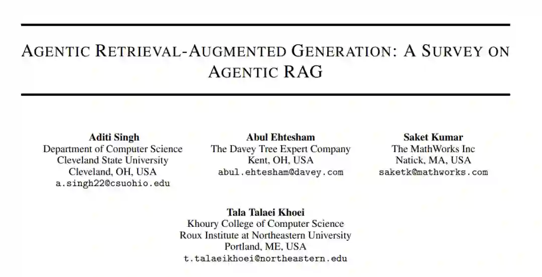 大语言模型(LLMs)[1, 2] [3],如OpenAI的GPT-4、Google的PaLM和Meta的LLaMA,凭借其生成类人文本和执行复杂自然语言处理任务的能力,已显著改变了人工智能(AI)领域。这些模型推动了各个领域的创新,包括对话代理[4]、自动内容创作和实时翻译。最近的进展已将它们的能力扩展到多模态任务,如文本到图像和文本到视频生成[5],使得从详细提示生成和编辑视频和图像成为可能[6],从而拓宽了生成式AI的潜在应用范围。尽管取得了这些进展,大语言模型仍面临显著的局限性,主要源于它们依赖于静态的预训练数据。这种依赖通常导致信息过时、产生幻觉响应[7],并且无法适应动态的现实世界场景。这些挑战突显了需要集成实时数据、动态调整响应以保持上下文相关性和准确性的系统。检索增强生成(RAG)[8, 9]作为应对这些挑战的一个有前景的解决方案应运而生。通过将大语言模型的生成能力与外部检索机制[10]结合,RAG系统增强了响应的相关性和时效性。这些系统从知识库[11]、API或网络等来源检索实时信息,有效弥合了静态训练数据与动态应用需求之间的鸿沟。然而,传统的RAG工作流仍然受限于其线性和静态的设计,限制了它们执行复杂多步骤推理、整合深层次上下文理解以及迭代优化响应的能力。智能体[12]的演进进一步增强了AI系统的能力。现代智能体,包括大语言模型驱动的和移动智能体[13],是能够感知、推理并自主执行任务的智能实体。这些智能体利用智能体工作流模式,如反思[14]、规划[15]、工具使用和多智能体协作[16],使其能够管理动态工作流并解决复杂问题。检索增强生成与智能体智能的融合催生了智能体检索增强生成(智能体RAG)[17],这一范式将智能体集成到RAG管道中。智能体RAG通过动态检索策略、上下文理解和迭代优化[18],实现了信息处理的自适应和高效性。与传统的RAG不同,智能体RAG通过自主智能体来协调检索、筛选相关信息并优化响应,在需要精确性和适应性的场景中表现出色。本综述探讨了智能体RAG的基础原理、分类法和应用。它全面回顾了RAG范式,如朴素RAG、模块化RAG和图结构RAG[19],以及它们向智能体RAG系统演变的过程。主要贡献包括详细的智能体RAG框架分类法、在医疗[20, 21]、金融和教育[22]等领域的应用,并提供了实施策略、基准测试和伦理考虑的见解。