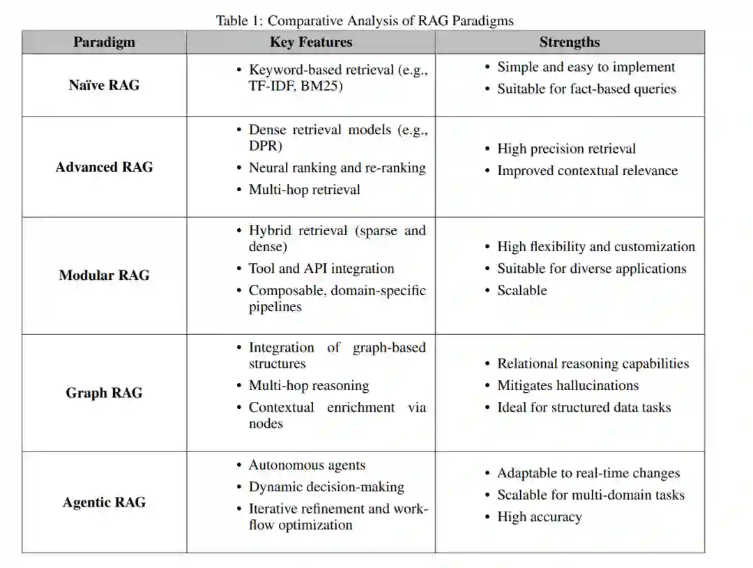 2.3.5 Agentic RAGAgentic RAG通过引入自主智能体,实现了动态决策和工作流优化。与静态系统不同,Agentic RAG能够根据查询的复杂性动态调整检索策略,并通过迭代优化提升响应质量。Agentic RAG在客户支持、金融分析和自适应学习平台等需要动态适应性和上下文精确性的领域中表现出色。