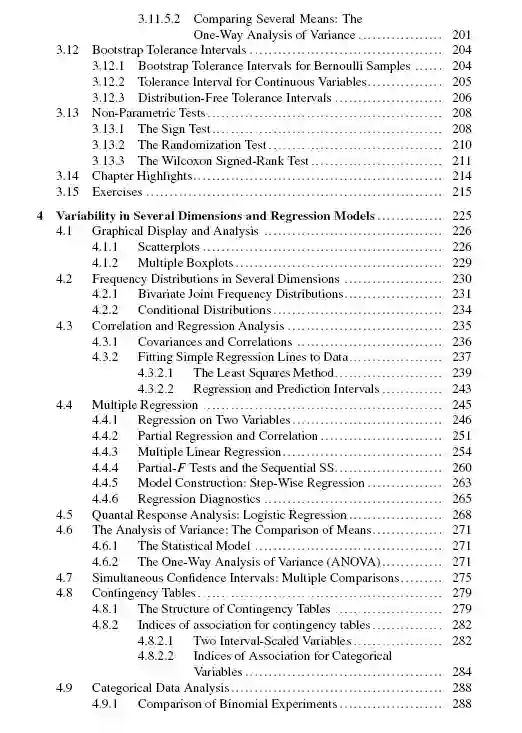 文本的第一章着重于分析可变性,概率模型和分布函数。接下来,作者介绍了统计推理和自举,以及几个维度的可变性和回归模型。然后,文本继续覆盖有限人口数量估计的抽样和时间序列分析和预测,以两章现代数据分析方法结束。每一章包括练习、数据集和应用程序来补充学习。