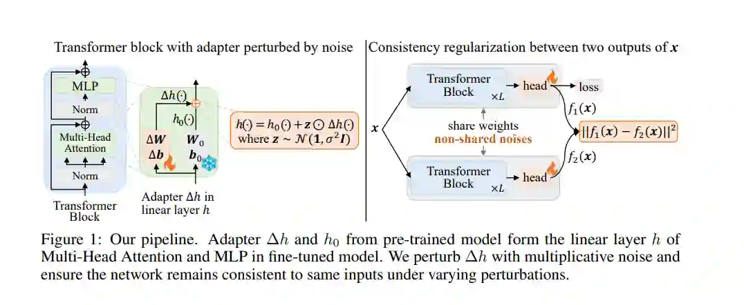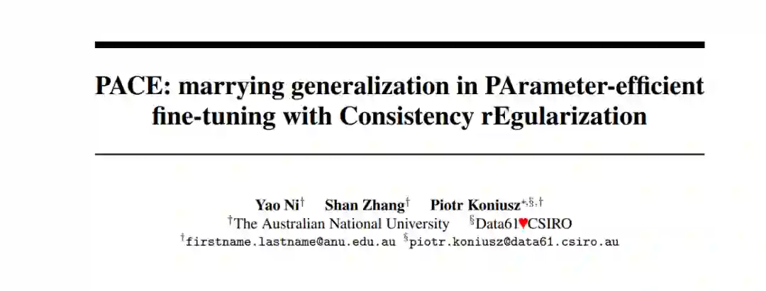 参数高效微调(PEFT)有效地将预训练的视觉变换器适应于下游任务。然而,任务性能的优化往往以微调模型的泛化能力为代价。为了解决这一问题,我们从理论上将训练过程中较小的权重梯度范数与较大的数据集联系起来,进而改善模型的泛化能力。受此启发,我们提出降低梯度范数以增强泛化能力,并使微调模型与预训练模型对齐,以保留来自大规模预训练数据的知识。然而,简单的对齐并不能保证梯度减少,反而可能导致梯度爆炸,增加管理梯度的难度。为了解决这些问题,我们提出了PACE,将参数高效微调的泛化与一致性正则化相结合。我们通过乘法噪声扰动适配器学习到的特征,确保微调模型在不同扰动下对同一样本保持一致。理论分析表明,PACE不仅隐式地对梯度进行正则化以增强泛化能力,还隐式地对齐微调和预训练模型以保留知识。实验结果支持我们的理论。PACE在四个视觉适应任务中超越了现有的PEFT方法:VTAB-1k、FGVC、少量学习和领域适应。代码将发布在MaxwellYaoNi/PACE上。