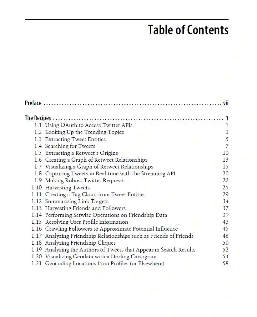 数百万的公开Twitter信息流中蕴含着丰富的数据,一旦你开始挖掘它们,你就可以获得一些有价值的见解。这本简洁的小书提供了一系列的配方,帮助你使用易学的Python工具提取Twitter的信息金块。每个配方都提供了关于解决方案是如何以及为什么工作的讨论,所以你可以快速地调整它以适应你特定的需求。配方包括以下技术: 使用OAuth访问Twitter数据 创建并分析转推关系图 使用流API实时收集推文 收集和分析朋友和关注者 发现友谊小组 从短URL汇总网页 这本书是O’Reilly的《挖掘社交网络》的完美伴侣。