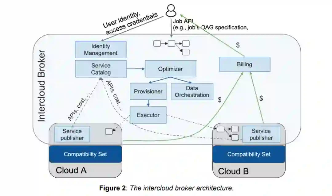我们认为,云市场这种增强兼容性的成熟将带来几个重要的好处,包括: (i) 降低云使用的壁垒,从而扩大整个云市场; (ii) 通过专门的云技术进行快速的技术创新(这将使用户能够访问最佳的服务和硬件); (iii) 更完整地集成各种计算选项(例如,边缘计算、内部计算和单个云内可用区域的选择); (iv) 通过跨云部署(例如,在多个云中托管模型推断以提高可用性,或在任何需要满足新的监管约束(如数据和操作主权)的地方处理机密数据)来增强遵从性、安全性和弹性的机会。然而,我们并不认为这种特定的兼容途径是成熟的必然结果,而是一种可取的、可实现的可能性,需要引入云间代理才能成为现实。因此,本白皮书不仅仅是对拟议技术创新的被动描述,而是对其创建的呼吁。具体来说,我们要求研究人员和实践者加入到构建云间代理的早期版本中来,这将有助于为云计算创造一个新的未来,我们称之为“云天计算(Sky Computing)”。