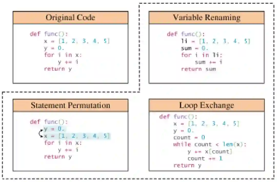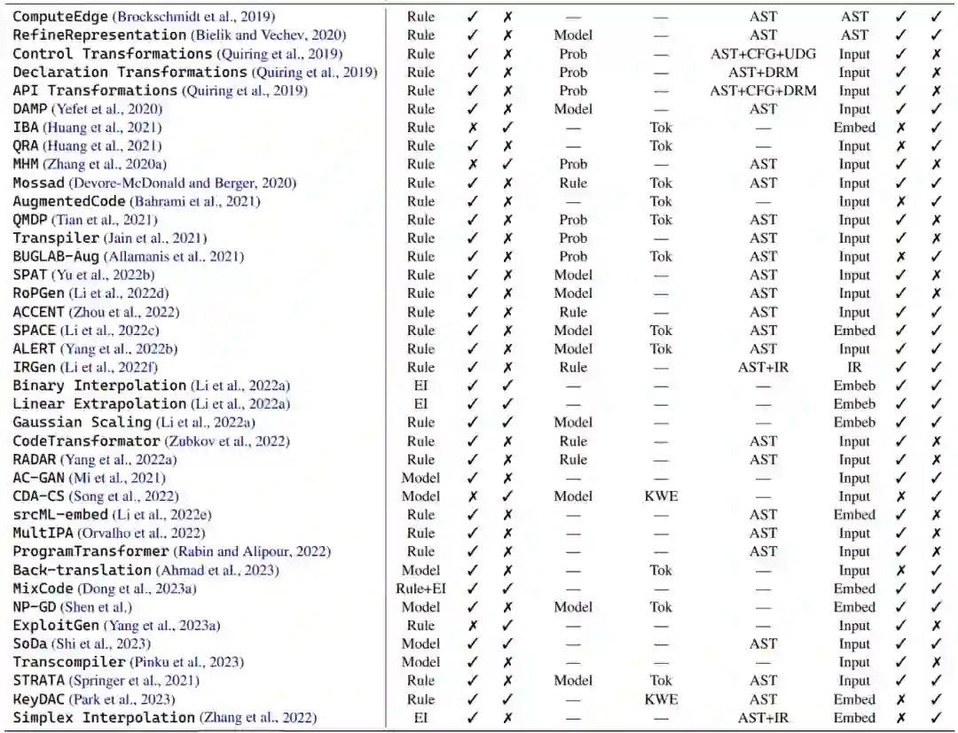 基于规则的技术:许多数据增强方法利用预定规则来转换程序,同时保证不破坏语法规则和语义。这些转换包括替换变量名、重命名方法名和插入无效代码等操作。除了基本的程序语法,一些转换还考虑更深层的结构信息,如控制流图和使用 - 定义链。有一部分基于规则的数据增强技术专注于增强代码片段中的自然语言上下文,包括文档字符串和注释。