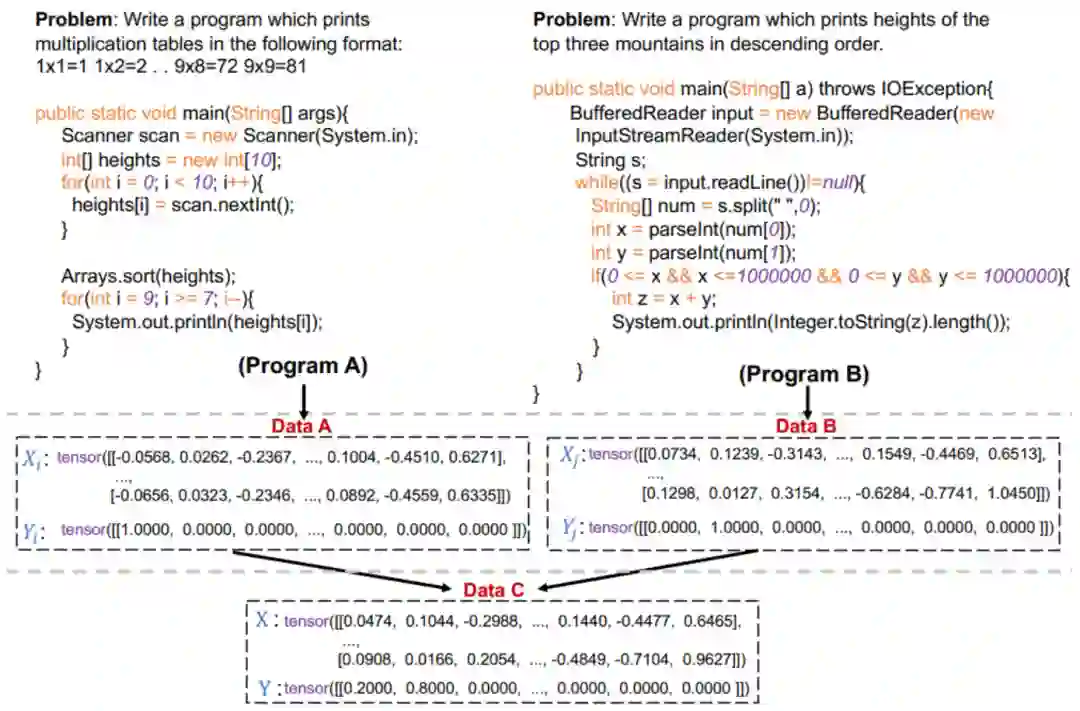 示例插值技术:这类数据增强技术源自 Mixup,它通过插值输入和两个或更多实际样本的标签来操作。例如,给定计算机视觉中的二分类任务和两张分别是狗和猫的图片,这些数据增强方法可以将这两张图片的输入和它们对应的标签根据随机选择的权重混合在一起。然而,在代码领域,这些方法的应用受到独特的程序语法和功能的限制。相比于表面层次的插值,大多数示例插值数据增强方法通过模型嵌入将多个真实样例融合为单一输入。例如,有研究将基于规则的技术与 Mixup 结合,混合原始代码片段及其转换后的表示。