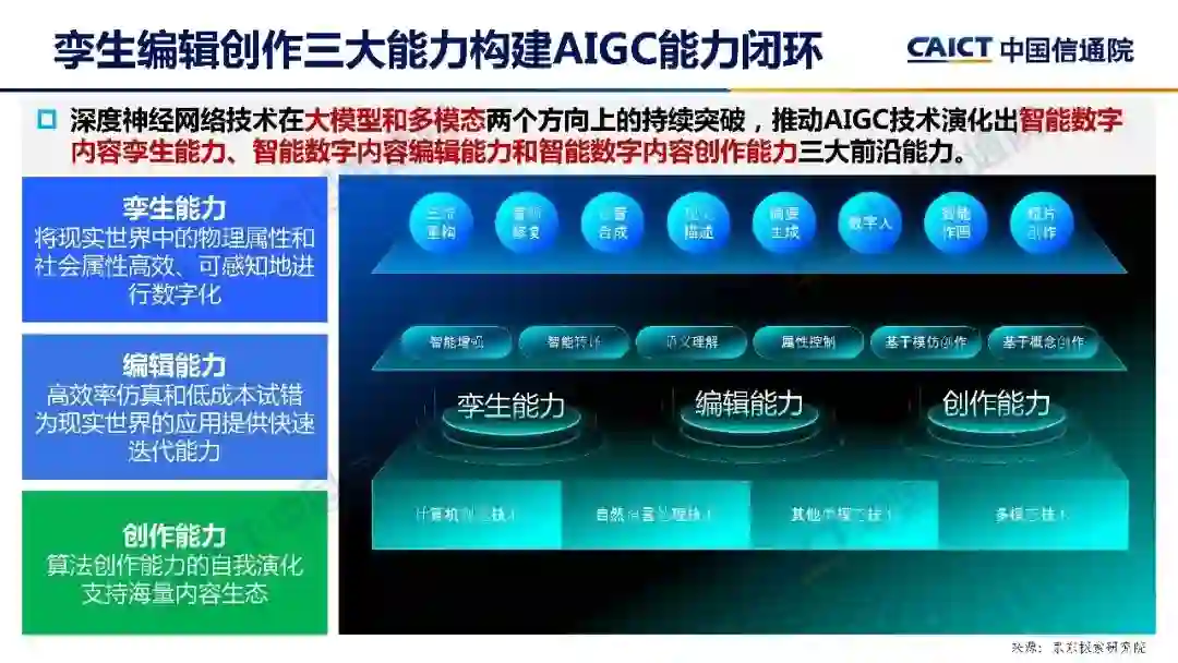 **白皮书对人工智能生成内容(AIGC)当前技术发展和能力体系做出全面梳理,认为深度神经网络技术在大模型和多模态两个方向上的持续突破,推动AIGC技术演化出孪生、编辑、创作三大前沿能力。**白皮书所提炼的AIGC技术能力体系,既涵盖了相关技术的最新进展和未来发展方向,也囊括了助力AIGC应用创新和产品落地的三大核心能力。 03