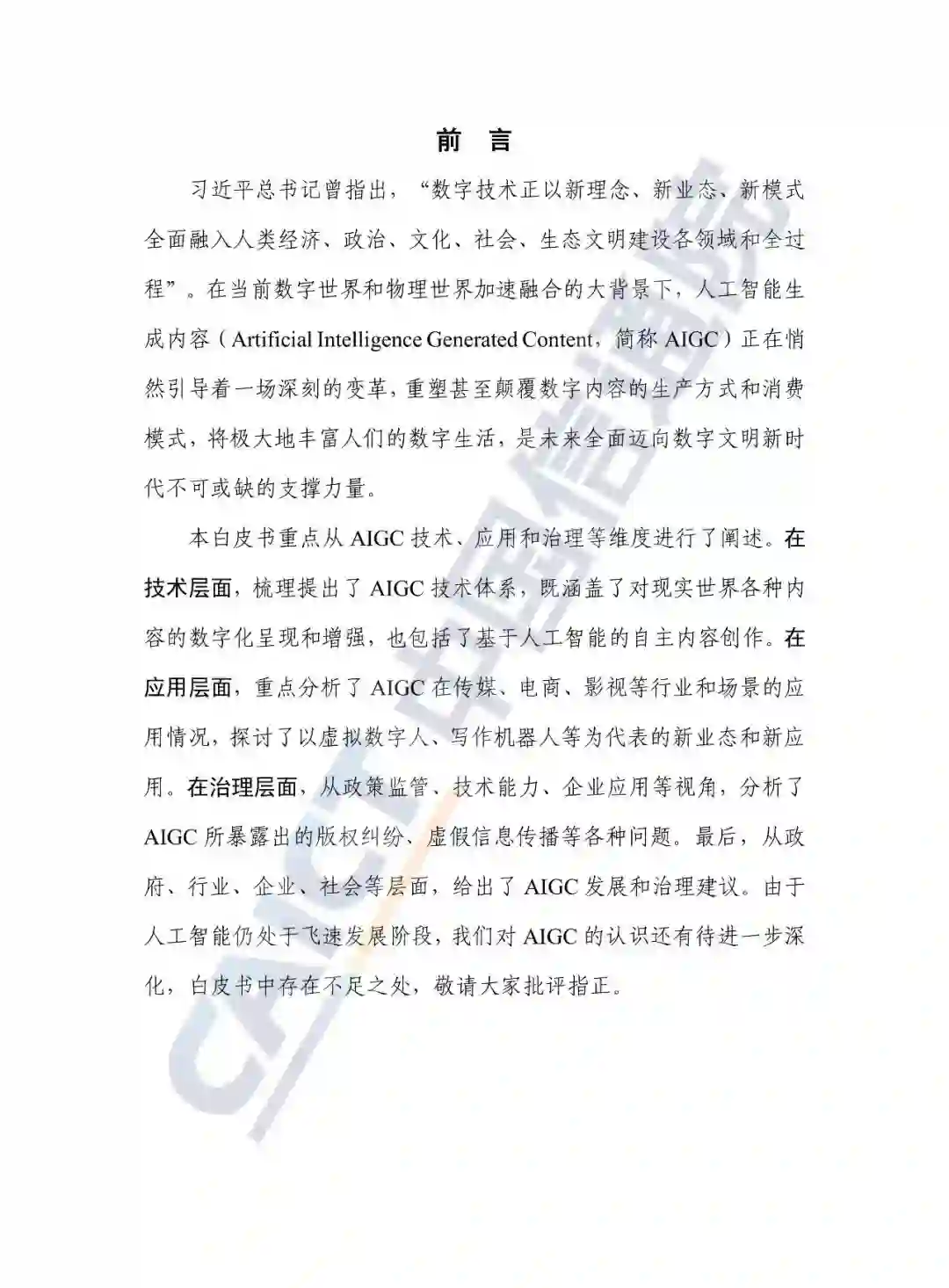 **白皮书跟踪梳理了人工智能生成内容的发展演进,重点从技术、应用、治理等维度对人工智能生成内容进行了分析,并从政府、行业、企业、社会等层面,给出了我国发展和治理人工智能生成内容(AIGC)的建议。