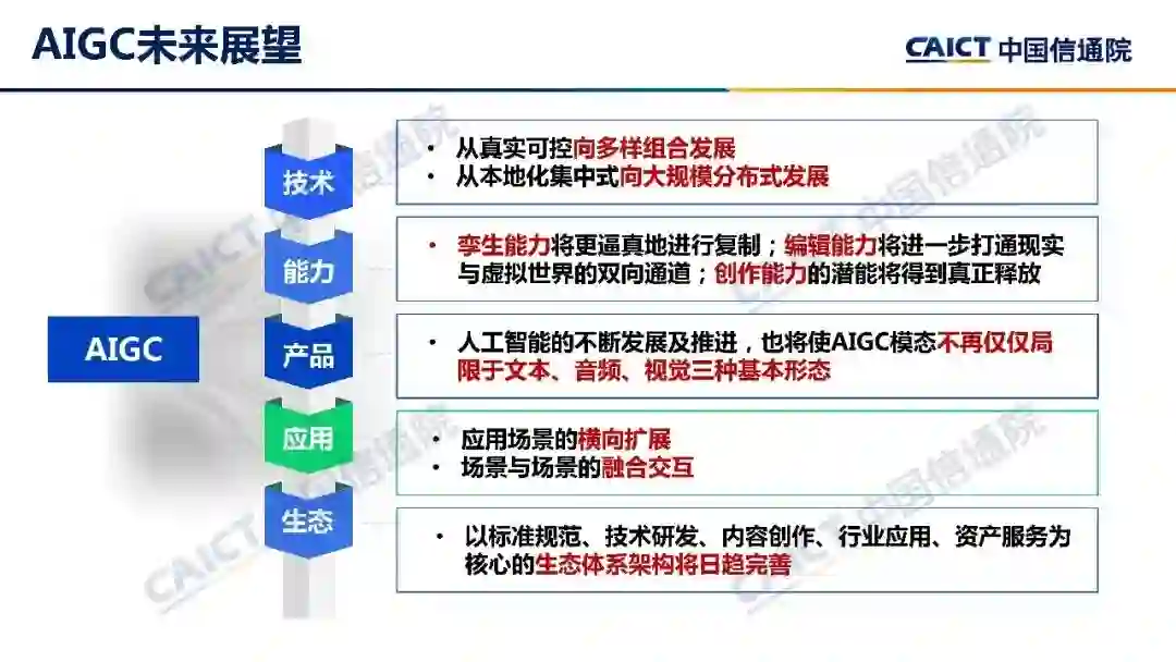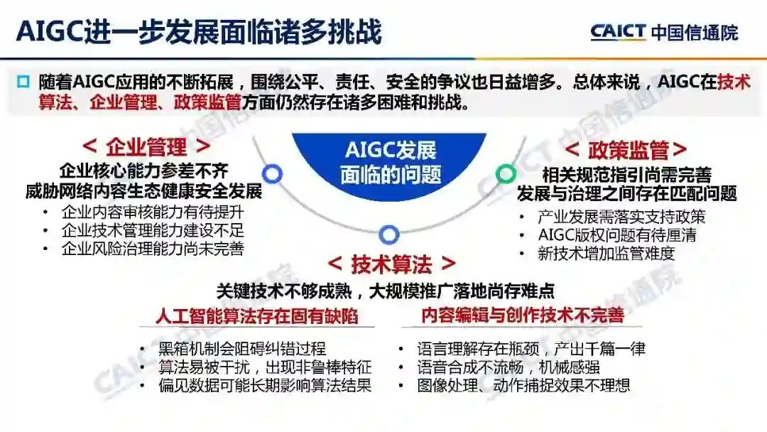 **本白皮书对我国人工智能生成内容发展中所存在的问题进行了客观分析,即人工智能生成内容(AIGC)的关键技术、企业管理和政策监管尚未完善,并提出建议对策。**白皮书从技术算法、企业管理、政策监管等视角,梳理了人工智能生成内容(AIGC)所暴露出的版权纠纷、虚假信息传播等各种问题,并从政府、行业、企业、社会等层面,给出了人工智能生成内容(AIGC)发展和治理建议。