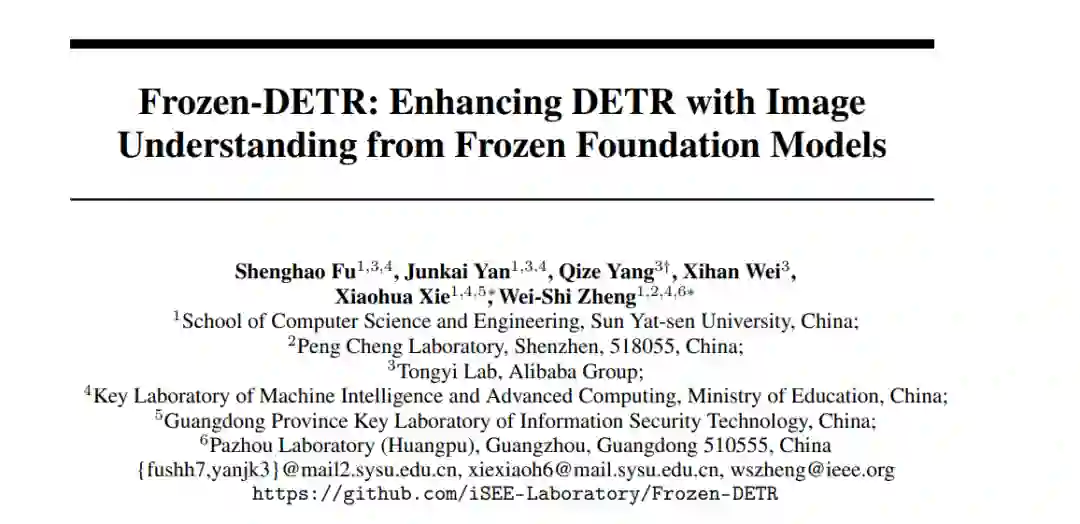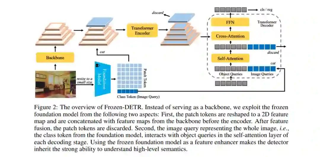 最近的视觉基础模型能够提取通用表征,并在各种任务中表现出强大的能力。然而,它们在目标检测中的应用尚未得到充分重视,尤其是在不对其进行微调的情况下。在本研究中,我们展示了即使没有为目标检测预训练的冻结基础模型也可以成为多功能的特征增强器。具体而言,我们探索了将基础模型的高级图像理解能力直接转移到检测器中的两种方式。首先,基础模型中的类别token提供了对复杂场景的深入理解,这可以通过提供紧凑的上下文来帮助检测器解码器中的对象查询解码。此外,基础模型中的patch tokens能够提供语义细节,从而丰富检测器编码器中的特征。将冻结的基础模型作为即插即用模块,而非常用的骨干网络,不仅显著提升了检测器的性能,还有效避免了检测器骨干网络与基础模型之间的架构差异所导致的问题。在这种创新范式下,我们将SOTA查询式检测器DINO的AP从49.0%提升到51.9%(+2.9% AP),并通过集成一个或两个基础模型,进一步提升到53.8% AP(+4.8% AP),该实验在COCO验证集上进行,检测器的骨干网络为R50,训练周期为12个epochs。